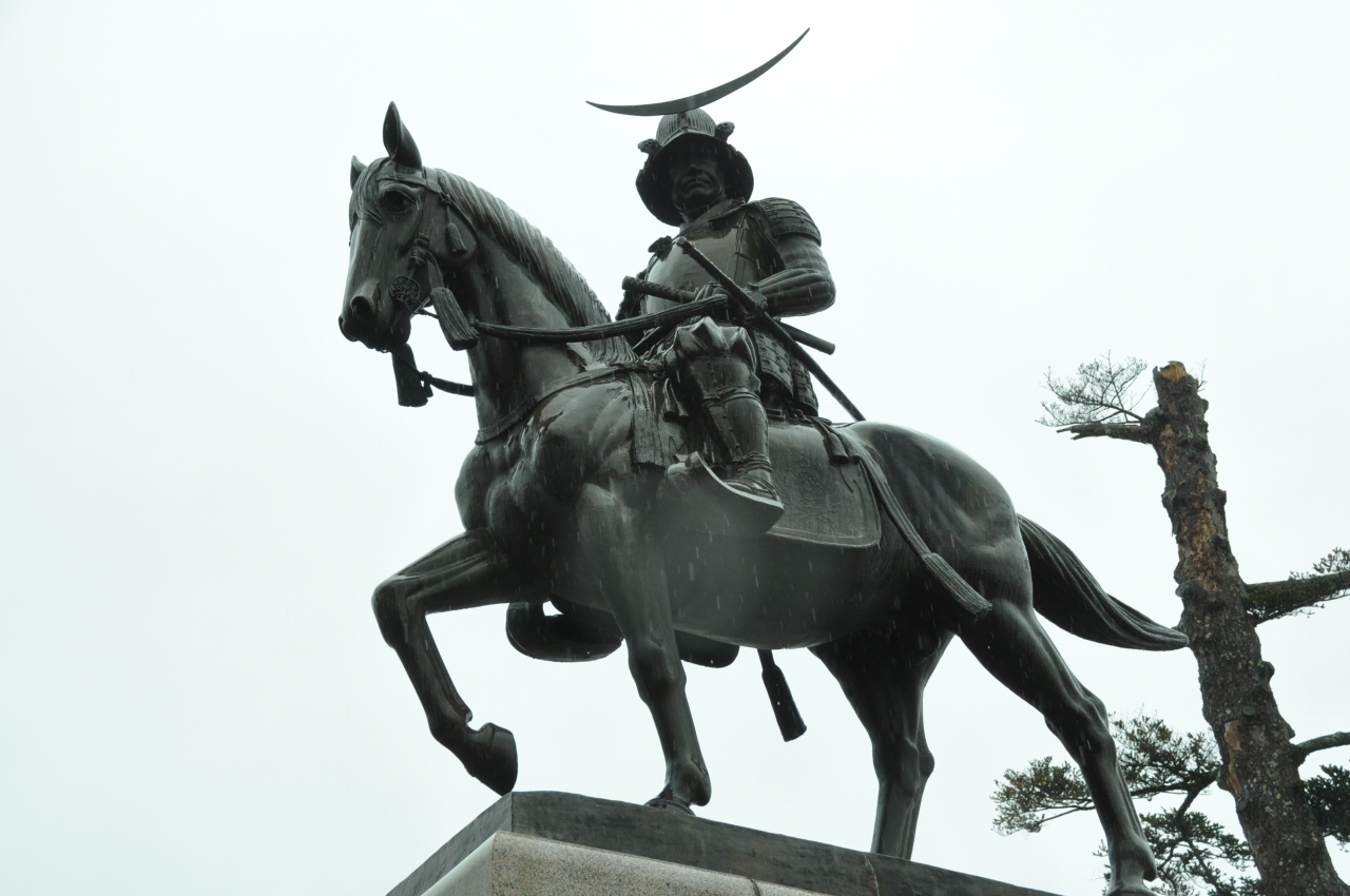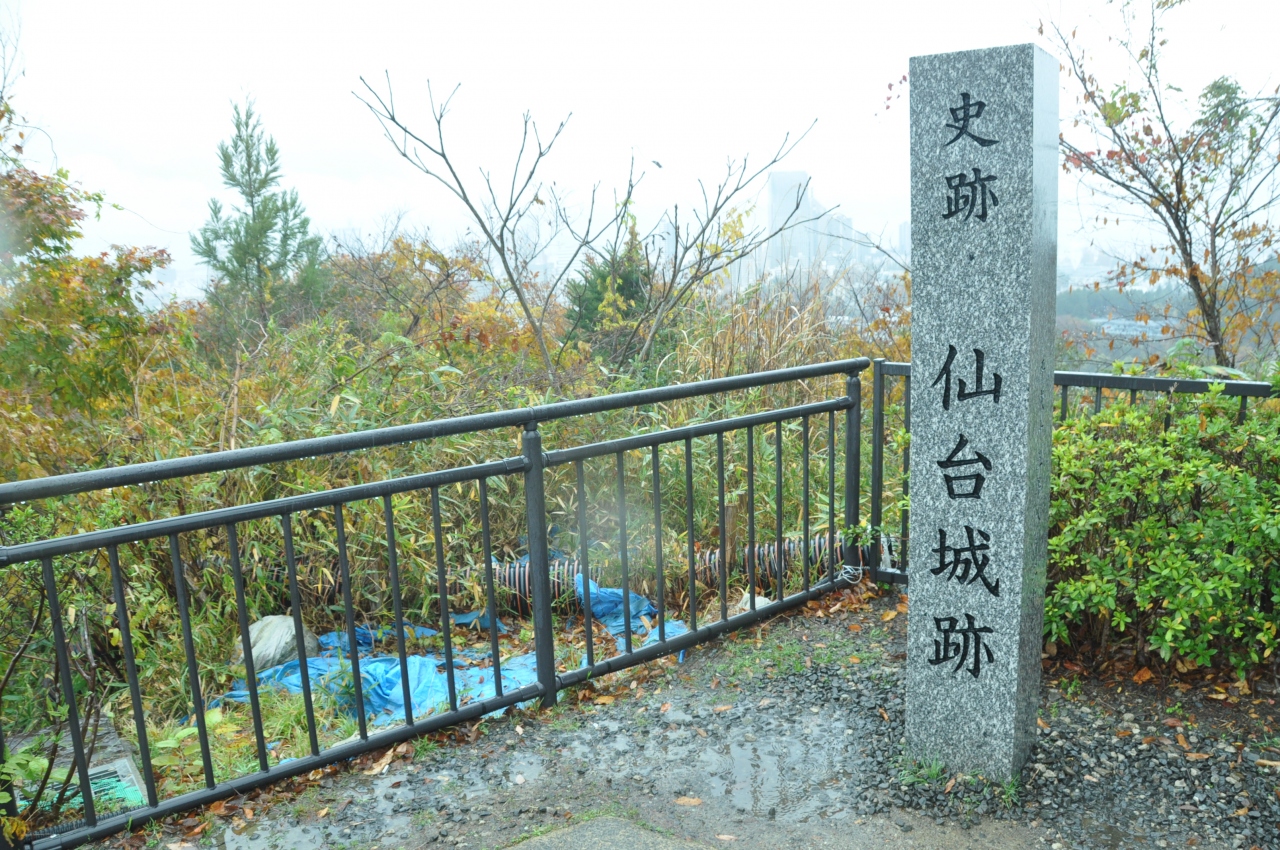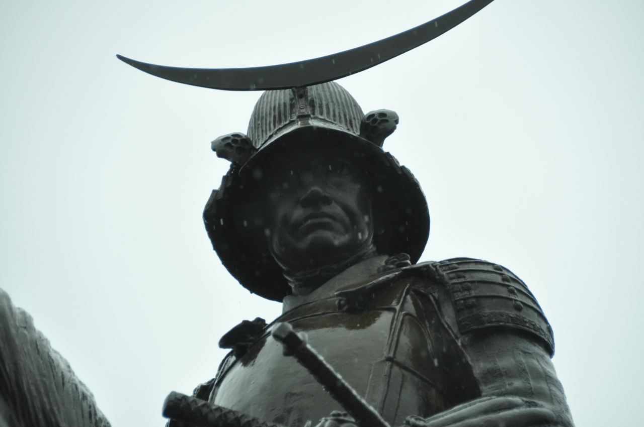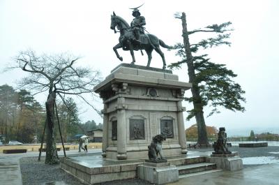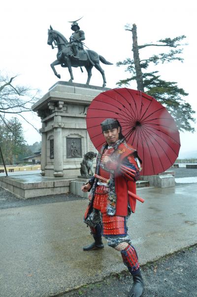 博物館の次に向かったのは青葉城跡。るーぷる仙台を降りると目の前に護国神社の大きな鳥居があった。それから進んで行くと、仙台の街を見下ろせる高台に出て、政宗公の銅像の後ろ姿が見えた。銅像前で写真を撮っていると、いつの間にか侍の装束をまとった武士が現れ、それもイケメンだった。写真を撮らせてもらうと、ノリノリで、いろんなポーズをしてくれた。撮影後に有り難うと言うと、「雨降りの方が仙台の街の美しさは際だつぞよ」と教えてくれた。確かに、わずかに残った紅葉はとても美しかった。