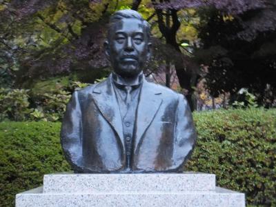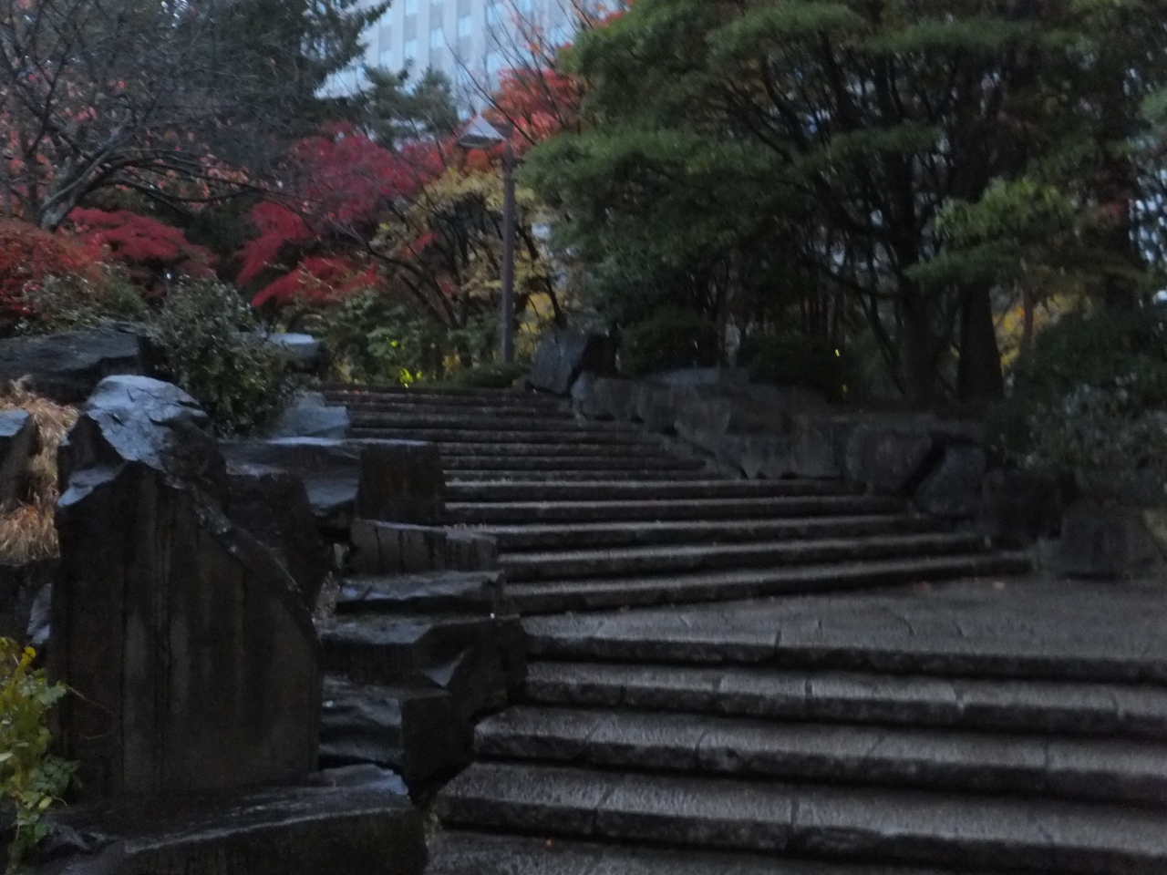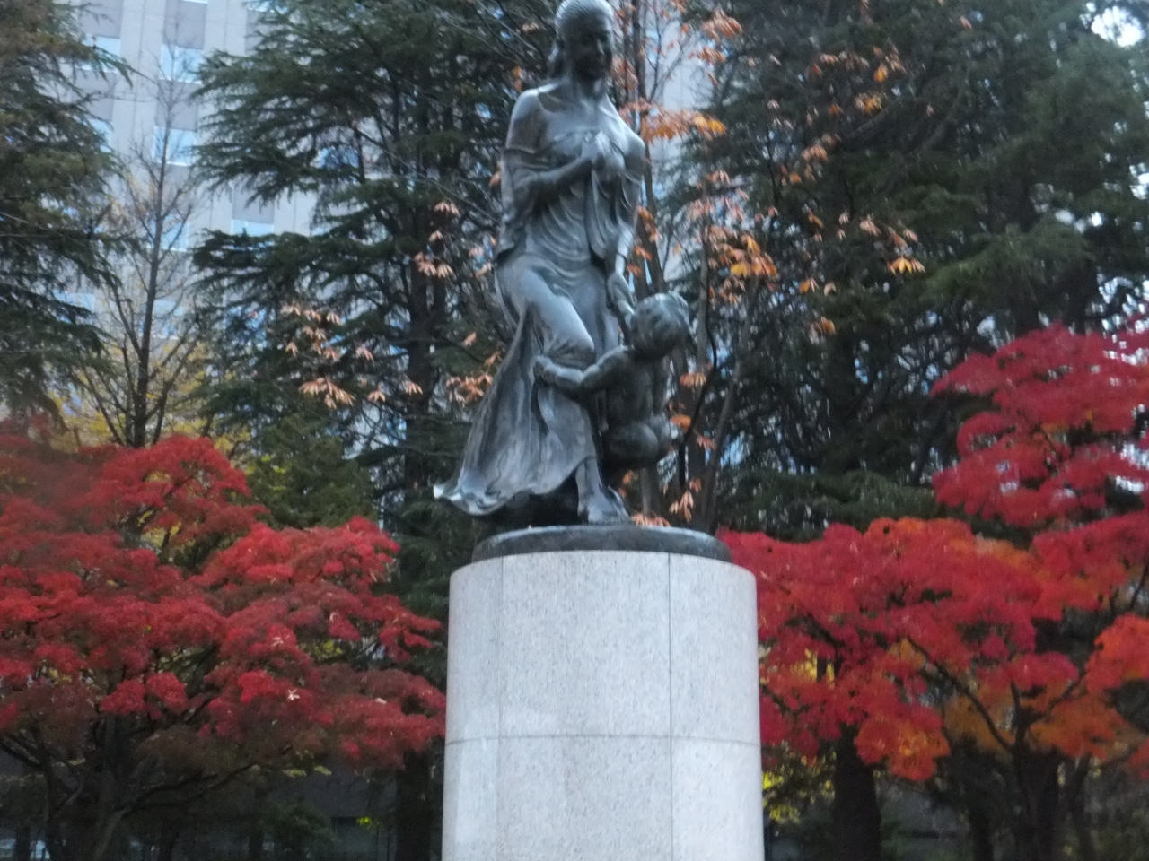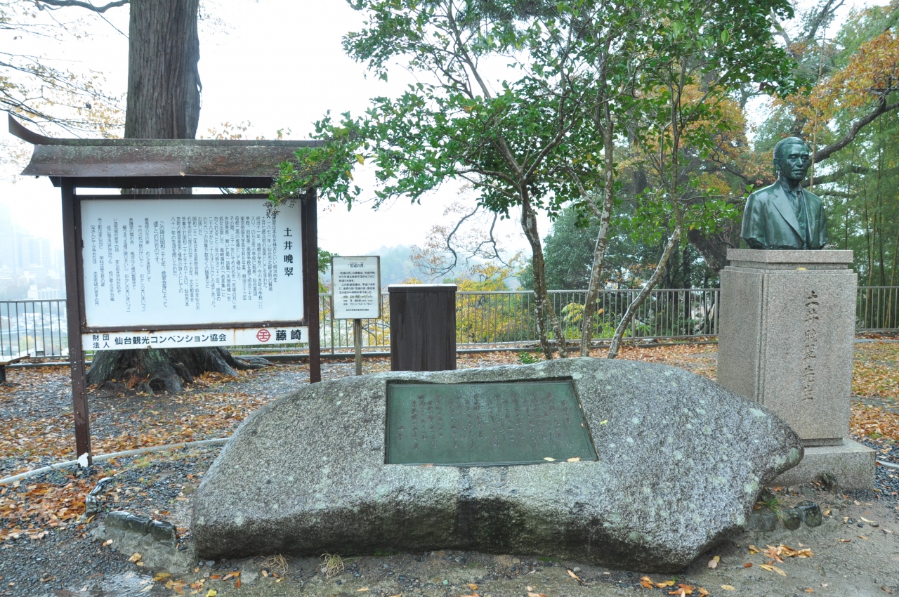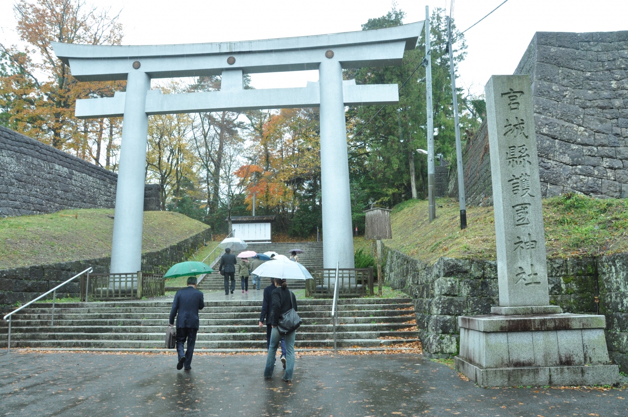博物館の次に向かったのは青葉城跡。るーぷる仙台を降りると目の前に護国神社の大きな鳥居があった。それから進んで行くと、仙台の街を見下ろせる高台に出て、政宗公の銅像の後ろ姿が見えた。銅像前で写真を撮っていると、いつの間にか侍の装束をまとった武士が現れ、それもイケメンだった。写真を撮らせてもらうと、ノリノリで、いろんなポーズをしてくれた。撮影後に有り難うと言うと、「雨降りの方が仙台の街の美しさは際だつぞよ」と教えてくれた。確かに、わずかに残った紅葉はとても美しかった。
