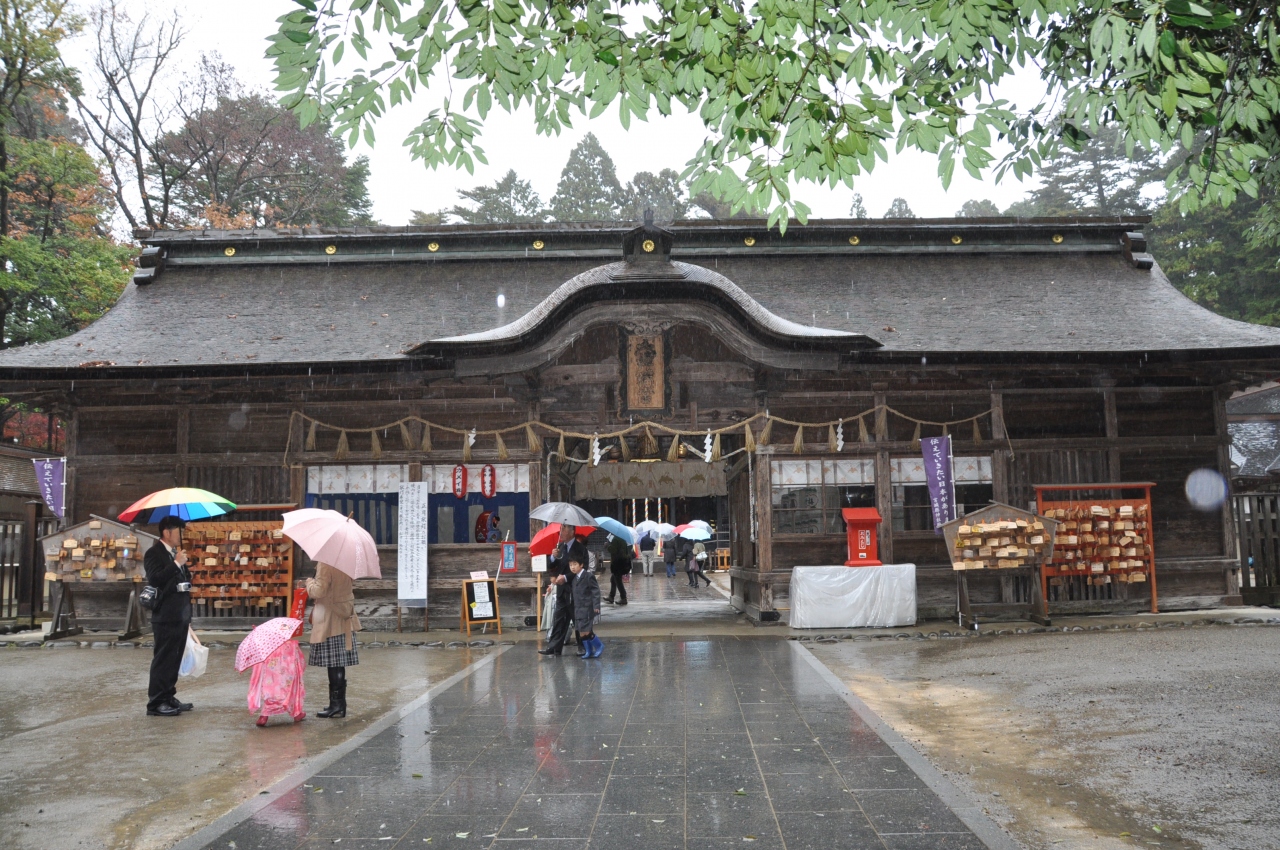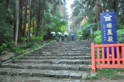るーぷる仙台を降りると、ここも石段を登って行く。雨はかなりひどかったが、上までたどり着くと、国の重要文化財に指定されている長床があり、木造のとても歴史を感じる建築物だった。