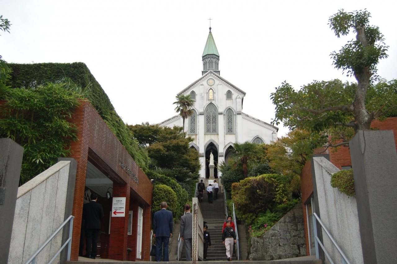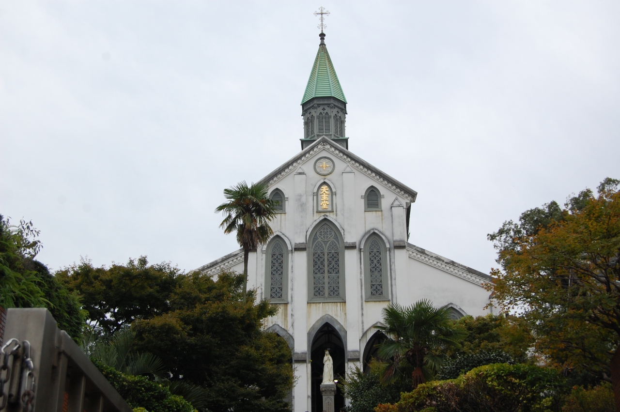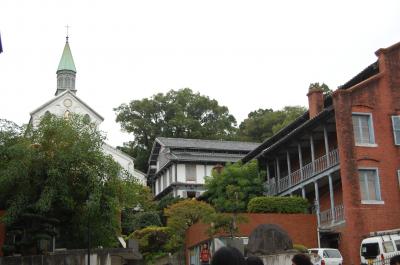 江戸末期の1864年に完成、現存する日本最古の木造教会だったが、1879年に改築され、外壁がレンガ構造になった。なお1953年に現行法で国宝に指定されている。訪問当日、ホテルでチェックインを済ませてグラバー邸を目指して坂を昇って行ったら、見えてきた。大浦天主堂は、この坂でグラバー邸とつながっているという位置関係にあることがわかった。坂から天主堂に向かう両サイドには垣根などが生い茂り、周囲の景観ともども異国情緒を醸し出している。
