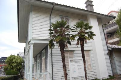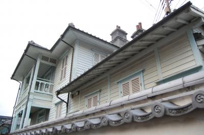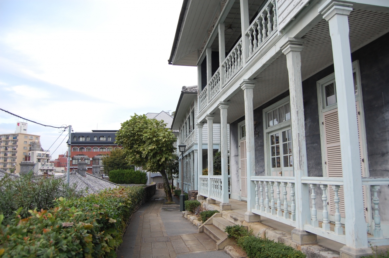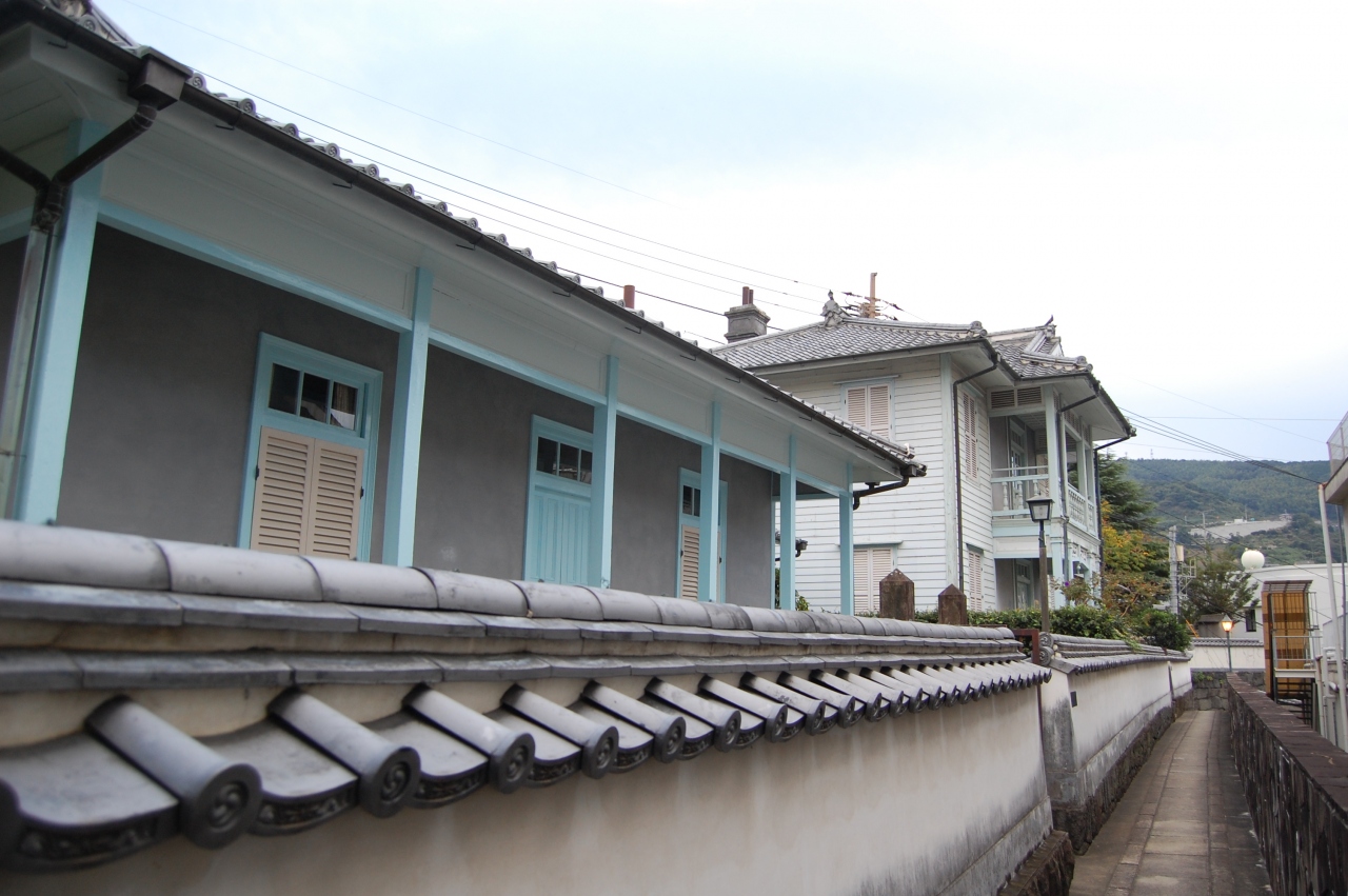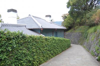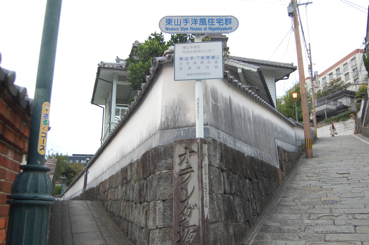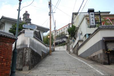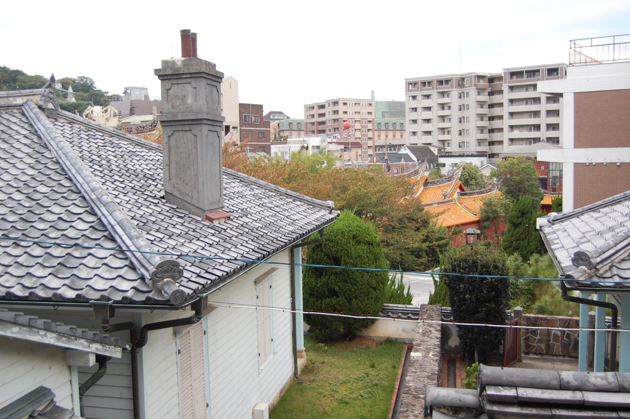 朝の散歩でグラバー園近くのホテルを出て、オランダ坂の方に歩いて行った。「オランダ坂」という表示のあるところに「東山手洋風住宅群」という標識があり道が二手に分かれていたので、少し広めの右側を目指した。しばらく登っていくと現れたのが、白壁に瓦葺き屋根の東山手洋風住宅群だ。高台なので建物の間から市街地が見え、孔子廟の黄色っぽい屋根も見えた。ここの7棟の洋館群は、明治20年代後半頃にまとめて建設され、敷地は急傾斜地を上下2段に造成しており、狭小な宅地に7棟もの建物が建つため、密集した形態となっているそうだ。