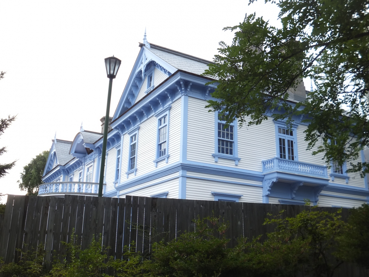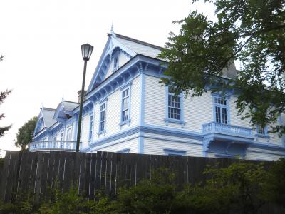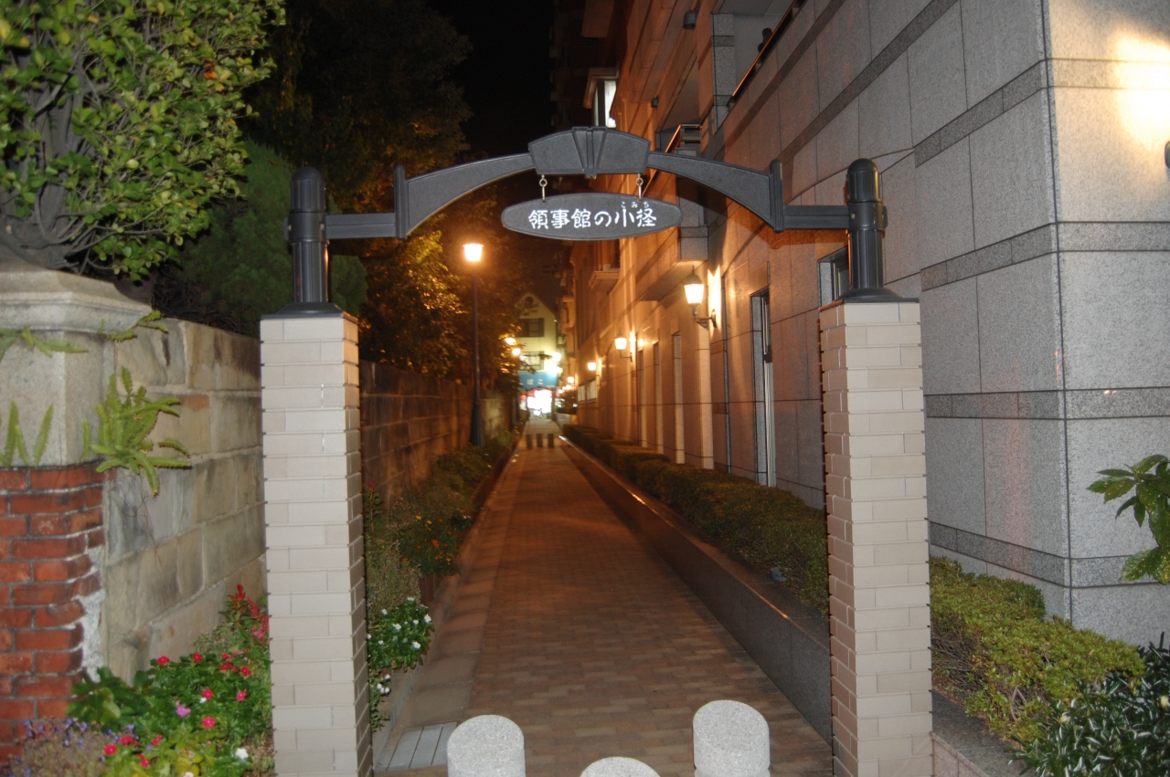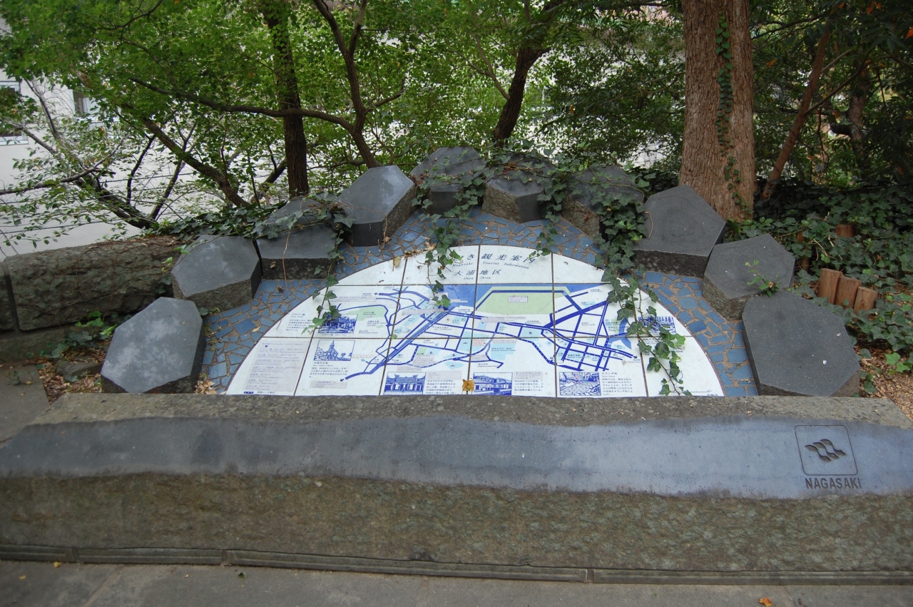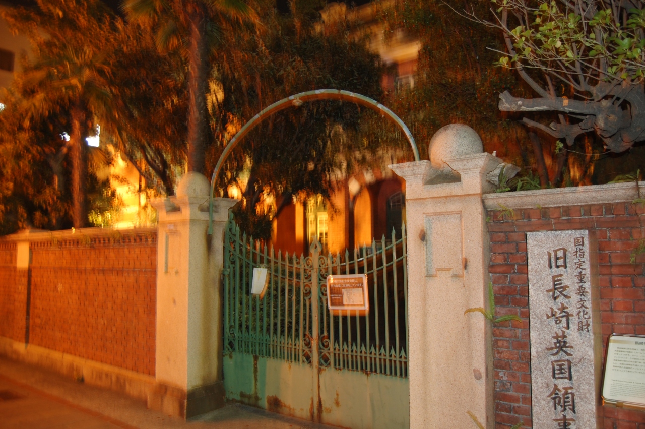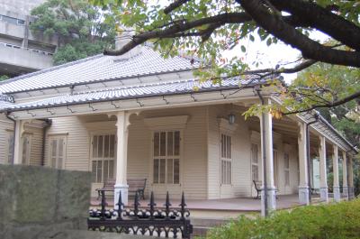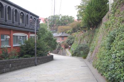 朝の散歩でグラバー園近くのホテルを出て、オランダ坂の方に歩いて行った。「オランダ坂」という表示のあるところに「東山手洋風住宅群」という標識があり道が二手に分かれていたので、少し広めの右側を目指した。しばらく登っていくと現れたのが、白壁に瓦葺き屋根の東山手洋風住宅群だ。高台なので建物の間から市街地が見え、孔子廟の黄色っぽい屋根も見えた。ここの7棟の洋館群は、明治20年代後半頃にまとめて建設され、敷地は急傾斜地を上下2段に造成しており、狭小な宅地に7棟もの建物が建つため、密集した形態となっているそうだ。