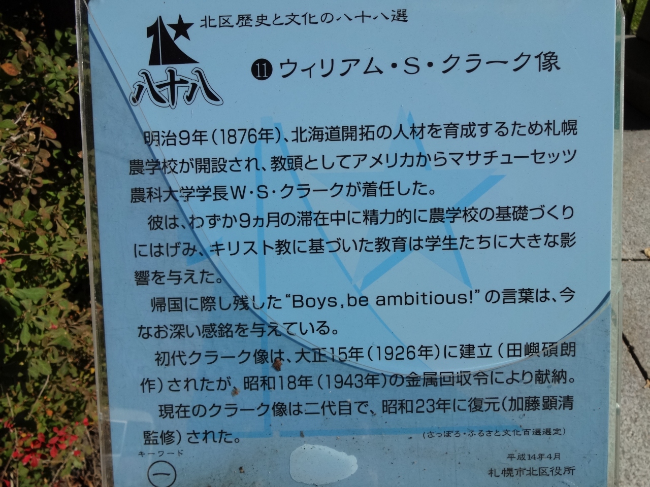 クラーク博士がアメリカから来道したきっかけは、アマースト大学で教えていた当時、学生の中に同大学初の日本人留学生がいて、それは新島襄(同志社大学の創始者)だった。その後、新島襄の紹介により、日本政府の熱烈な要請を受けて、1876年(明治9年)に札幌農学校教頭に赴任した。クラーク博士は名目上は教頭だが、実質的には校内のほとんど全てを取り仕切っていたそうだ。だから北海道の開拓や人材育成にあたったということで賞賛されているのだろう。- 旅行時期