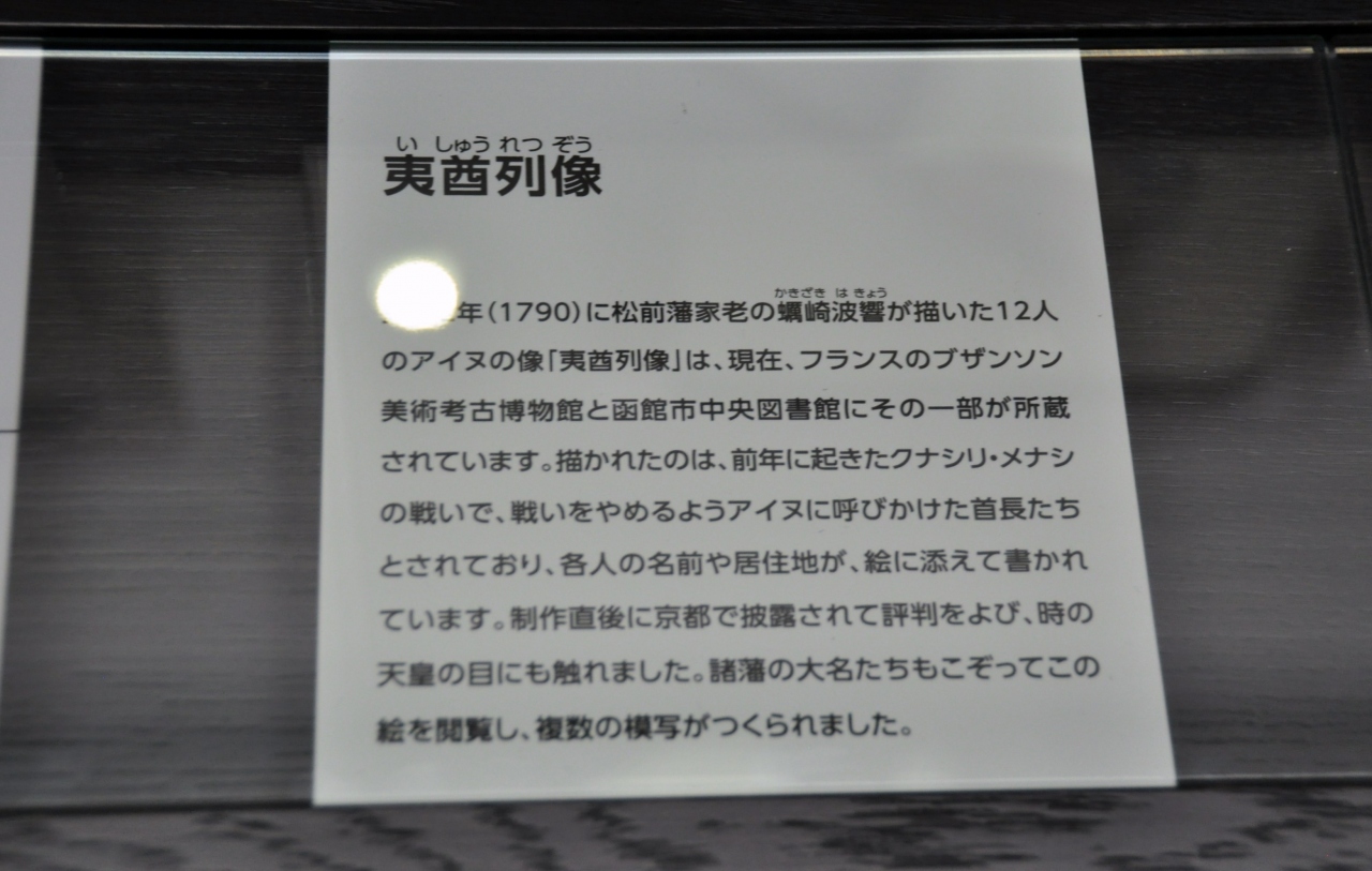 常設展示している展示物はそれほど多くはないが、北海道の歴史や文化に関する展示という点では国内最高峰ではないだろうか、ということは世界一? その理由は、例えばアイヌから和人への交易品に「クマやトドの毛皮」があった事は記録にあっても、実物はなかなかお目にかかれないが、ここにはクマはもちろんトドの毛皮も展示していた。そして夷酋列象だ。実物はブザンソン美術考古博物館と国内に点在するだけだが、多くの模写があり、北海道博物館にも展示されている。やはり見応えは十分。- 旅行時期