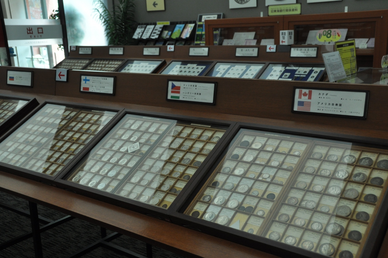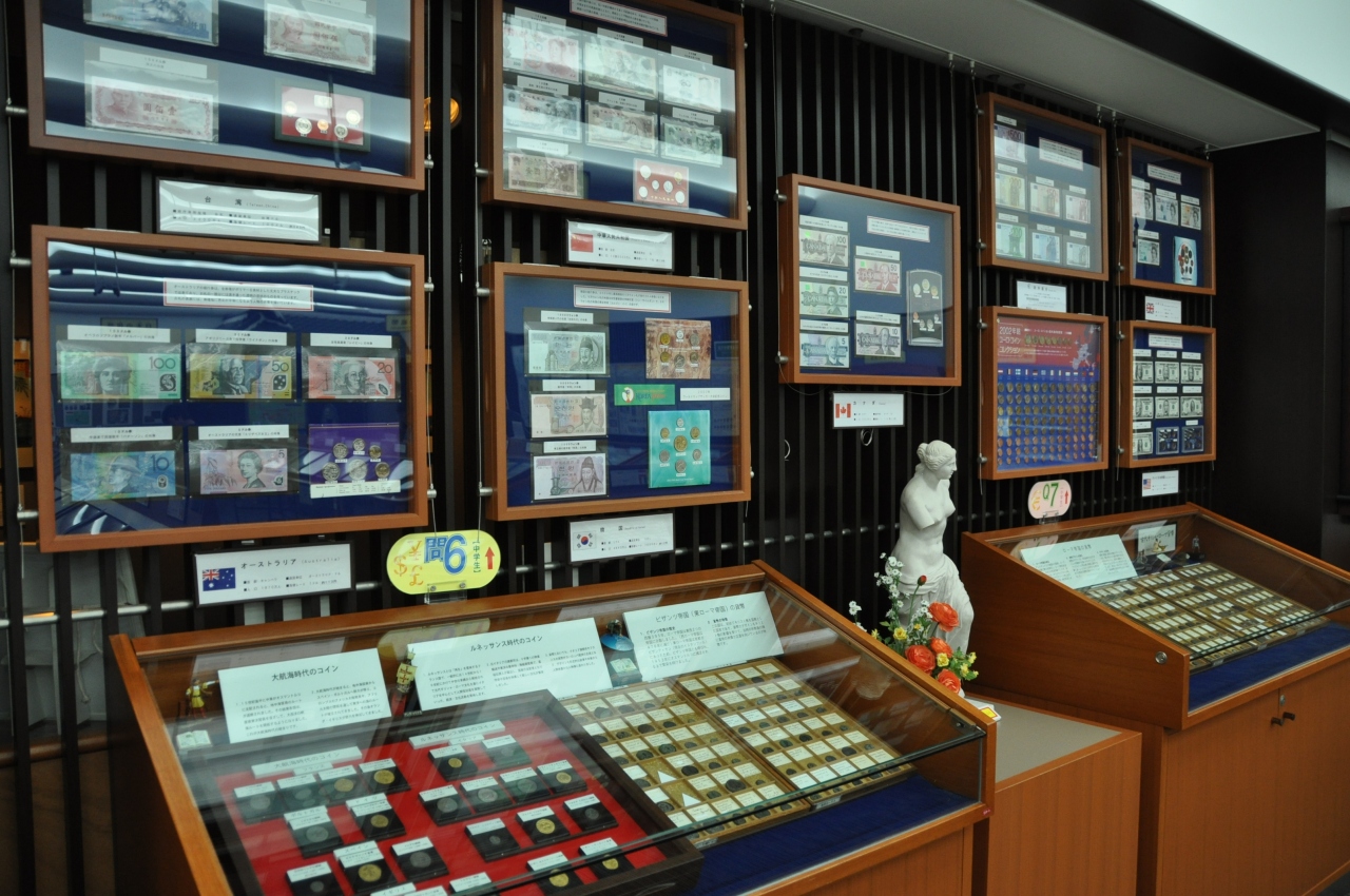 日本及び世界各国の貨幣約1万点を体系的に展示している。また「東海道五拾三次」に代表される歌川廣重の版画類を所蔵・展示している。浮世絵は、もともと大量生産の版画であり、江戸期には芸術作品と認識されておらず、現在の古新聞と同じ感覚で、海外へ陶磁器を輸出する際の緩衝材・包み紙として利用されていた。欧米人がそれを目にしてコレクター等が現れ、折しも明治期や戦後に、生活のため財宝処分や資産分売等で版画類も大量に海外流出したという経緯がある。このような背景のもと常時入館無料で日本文化を広く人々に公開しているという企業努力は素晴らしい。
