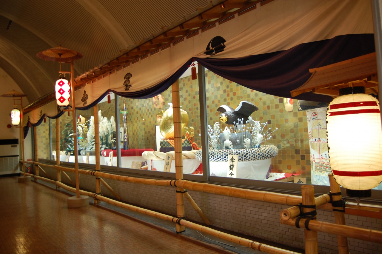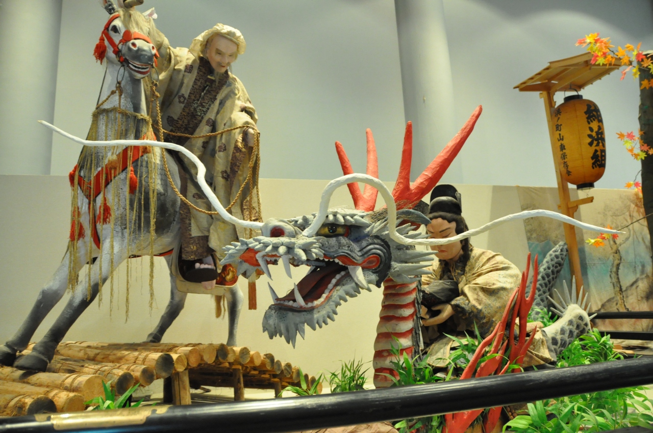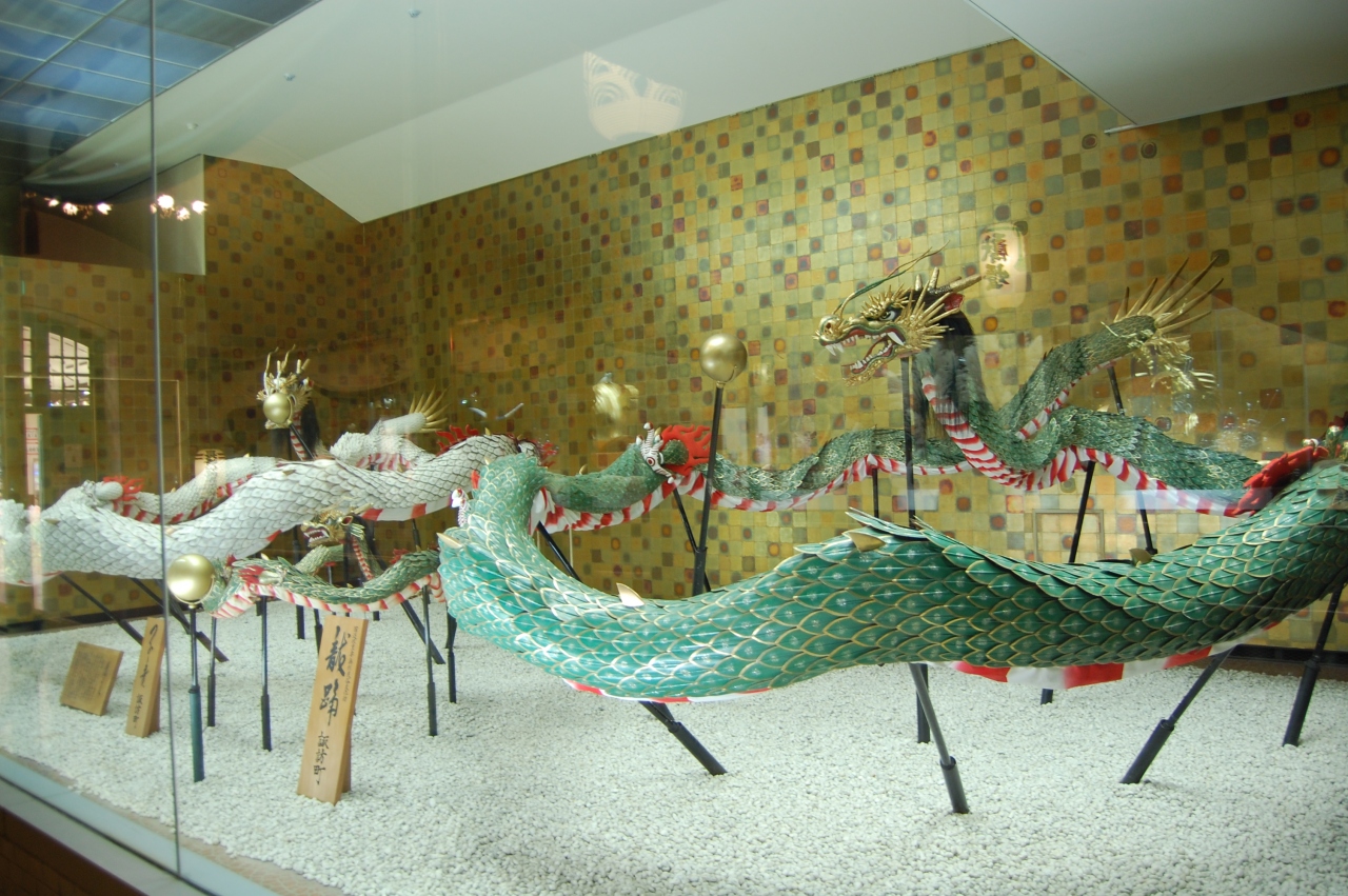 「長崎くんち」に奉納される龍踊りの白龍、青龍、傘鉾(かさぼこ)などが展示されている