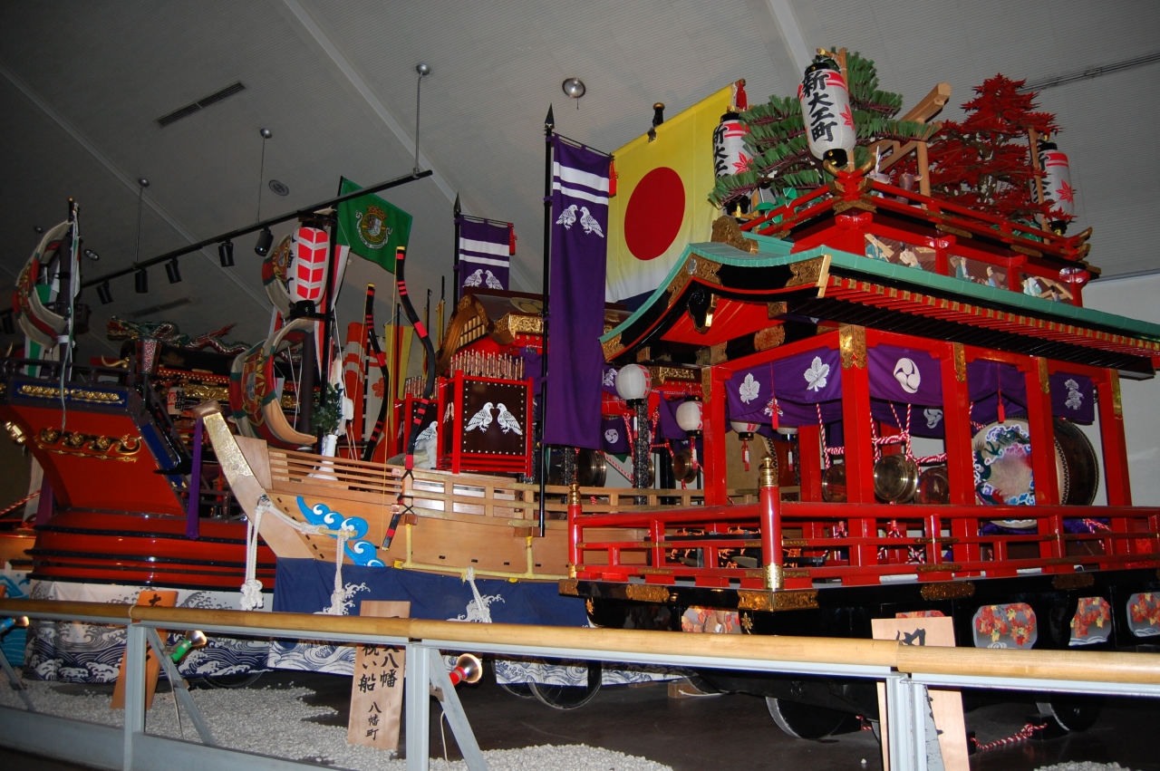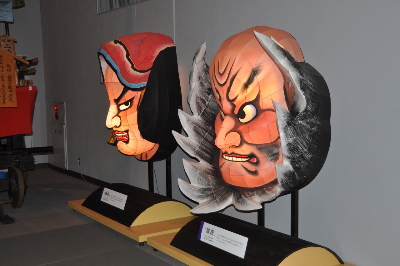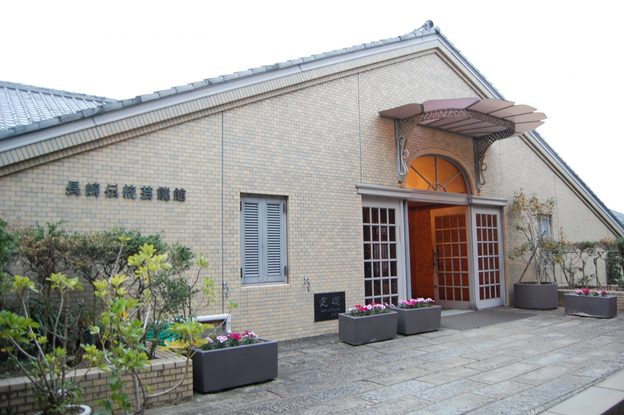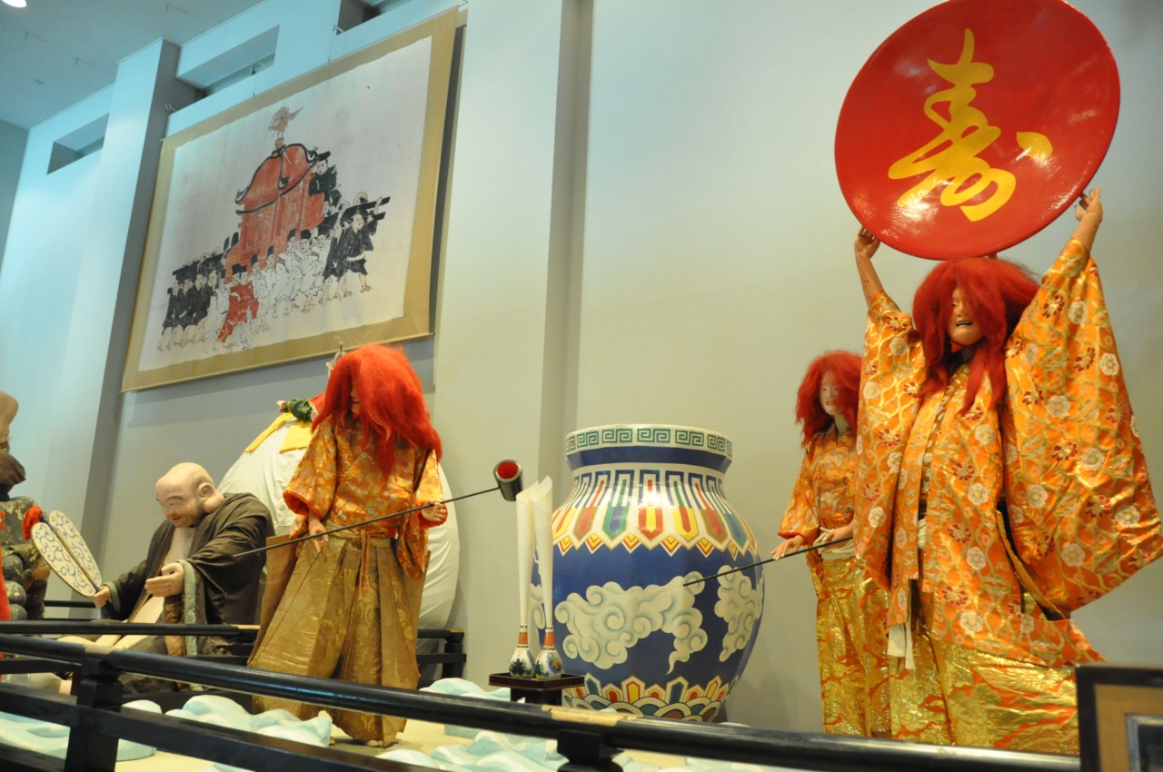 「長崎くんち」に奉納される龍踊りの白龍、青龍、傘鉾(かさぼこ)などが展示されている