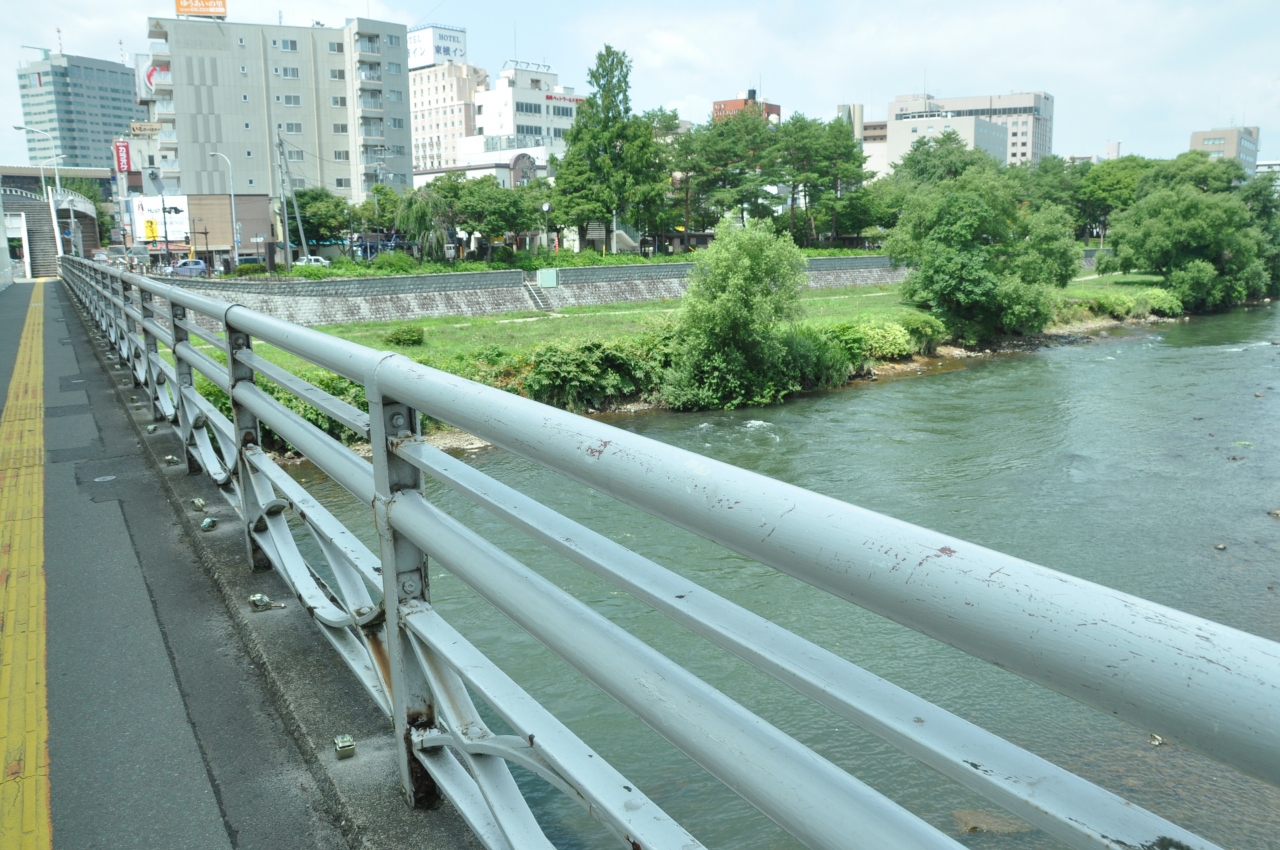 盛岡駅を出てホテルに向かう際、事前にネットや地図を見て、だいたいこっちの方に行けばいいなと頭の中に思い描いていたつもりだった。しかし一歩駅を出ると、盛岡駅周辺はビル街でありなおかつ交通量が多く、簡単に道路を渡ることもできない。地下道を通り、再度スマホの地図で確認しながら「こっちの方かな」と思いながら恐る恐る進んでいった。だから開運橋は工事中でもあり、ホテルに行くまでは開運橋を意識する余裕はなかった。一方、翌日は午前中に盛岡市内見学を終え、「ホテルから駅まではこの道を行けばよい」とわかったので、余裕を持って開運橋を見ることができた。悠然と流れる北上川を見ていると、「北上川、南部より流るる大河なり」という「奥の細道」の一節(もちろん平泉の段)を思い出した。