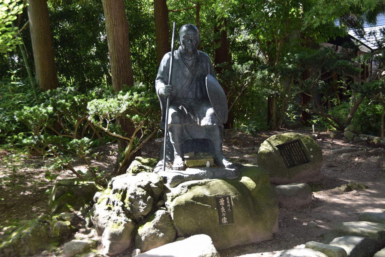 山寺は2度訪問し、芭蕉と曾良の像は2回とも見ているが、寄贈者が(株)でん六社長父子だということを最近知った。なぜ寄贈者がでん六社長父子なのか?(株)でん六は山形市に本社を置き、「地域への恩返し」として、(株)でん六創業者の鈴木傳六氏が1972年に芭蕉像を寄贈したそうだ。その後「おくのほそ道紀行300年」を記念して1989年に息子さんの鈴木伝四郎さんが建立したそうだ。実際の芭蕉像と曾良像は数メートル離れており、一枚の写真に収めようとすると結構大変だった。芭蕉像の右側に石碑があり、そこには「せみ塚」と同じ「閑さや岩にしみ入る蝉の声」の句が彫られていた。