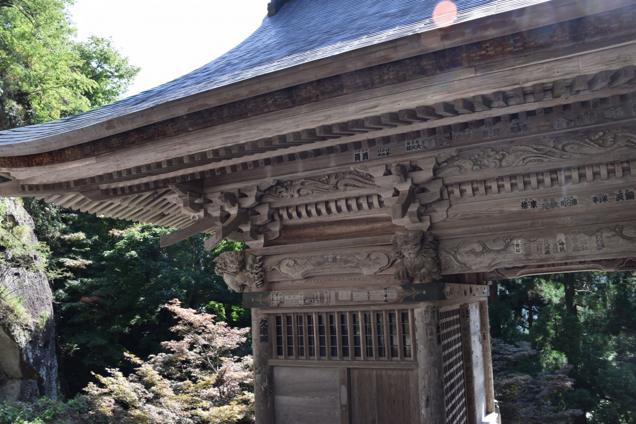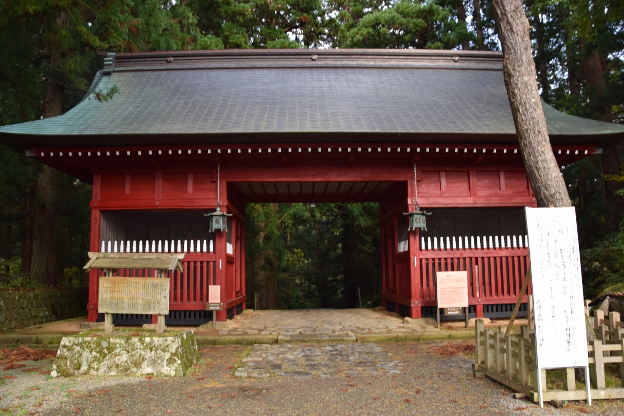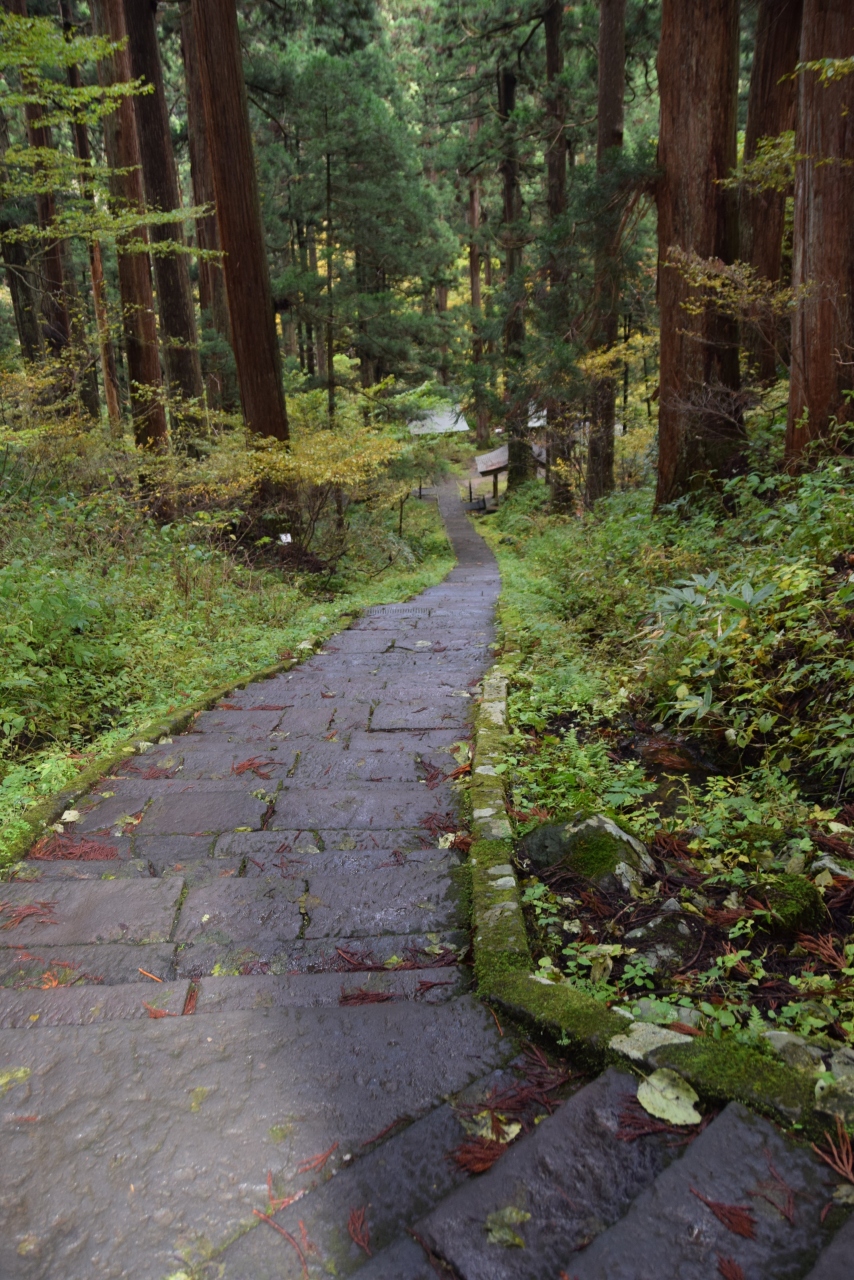 仁王門の場所は、登山口から奥之院のちょうど中間地点ぐらいだろうか。とても見応えのある門で、この辺りの様子は芭蕉翁が「奥の細道」で「岩に巌(いわお)を重ねて山とし、松柏年旧(ふ)り、土石老いて苔滑らかに・・・・」と記しており、この表現が正にピッタリだ。