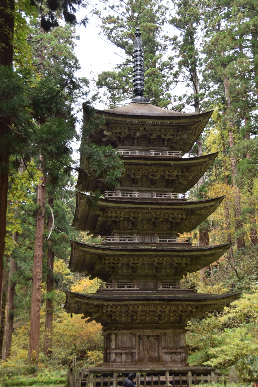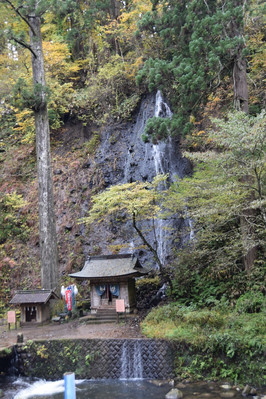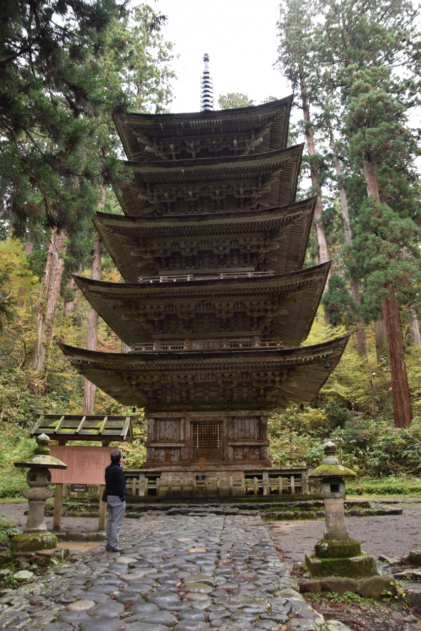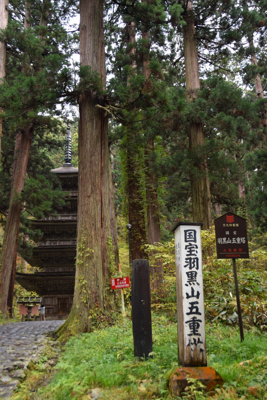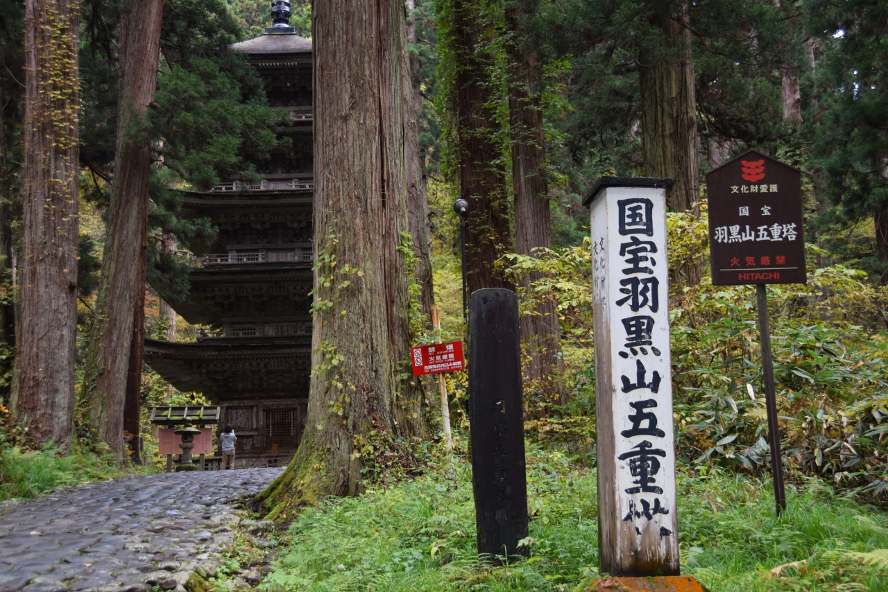 鳥居の手前右側に「羽黒山 月山 湯殿山 出羽三山神社」という碑があって、鳥居をくぐって進むと、朱色の随身門がある。随身門を進むと、下り坂の石段が続く。随身門から羽黒山頂までの1,7kmの両側には杉並木が続くが、これは国の特別天然記念物ということだ。その後、参道の両側に小さな神社がある所を通ると右側に滝が見え、工事中の個所があった。更に進むと、羽黒山の爺(ジジ)杉というのがあり国の天然記念物に指定され、羽黒山では最大最古の巨木ということだ。その爺杉を過ぎて更に進むと、国宝羽黒山五重塔が見えてくる。ここでしばらく写真を撮った後、時間が押しているという理由をつけて、頂上登山は断念して随身門方面に引き返した。