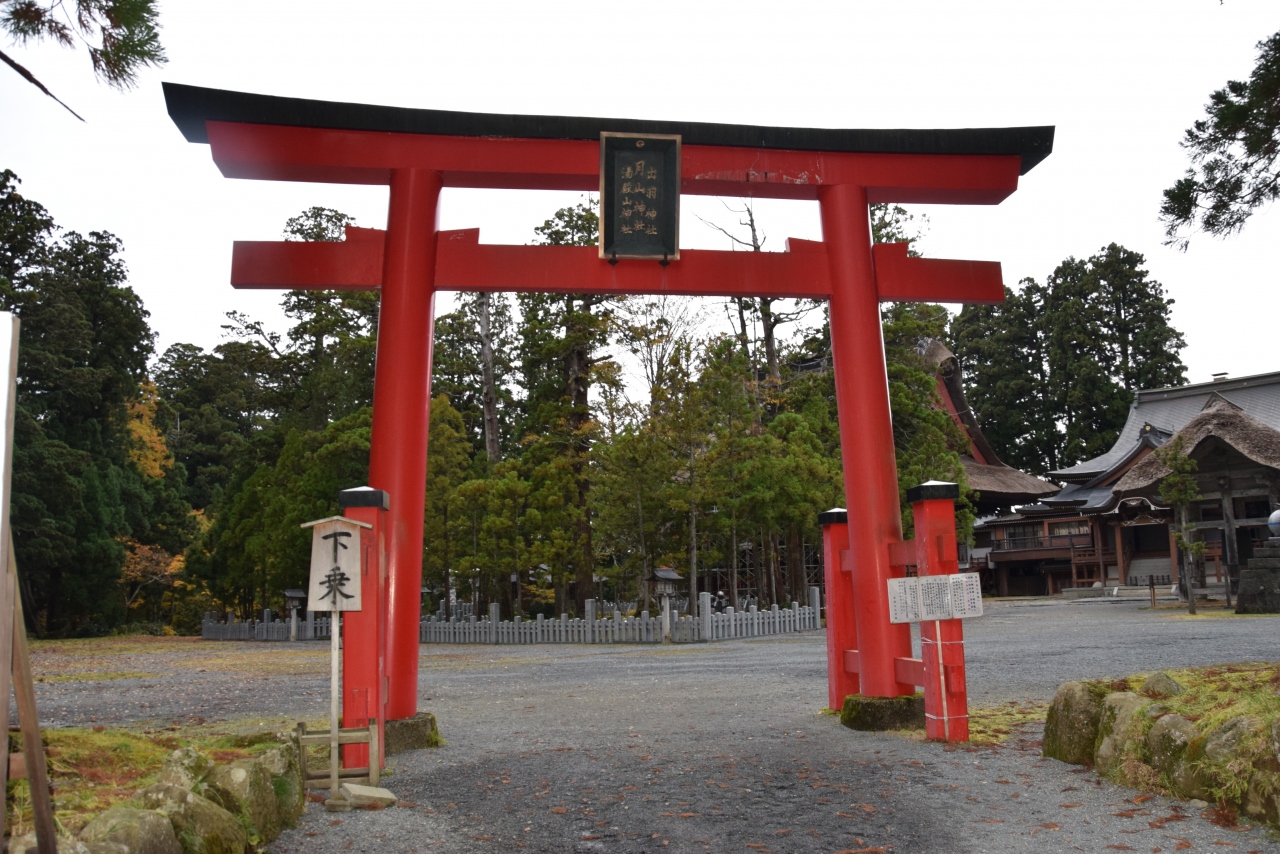 羽黒山三社合祭殿駐車場に車を置いて、しばらく山道を歩くと、三社合祭殿境内に出る。