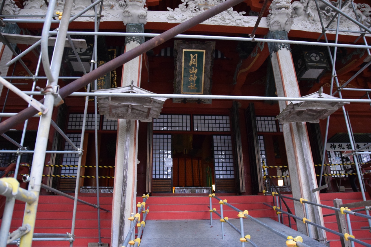 境内には大小いくつかの社殿があり、国の重要文化財である三神合祭殿は御屋根御修理中だったが、参拝できた。少し離れた所から三神合祭殿の屋根を含めて眺めると、その立派さがよくわかった。境内には蜂子社、厳島神社という小さな社殿もあり、周囲を木の棒で囲っており、これは時節柄冬囲いだろうか。また鐘楼と梵鐘は国の重要文化財に指定されていた。