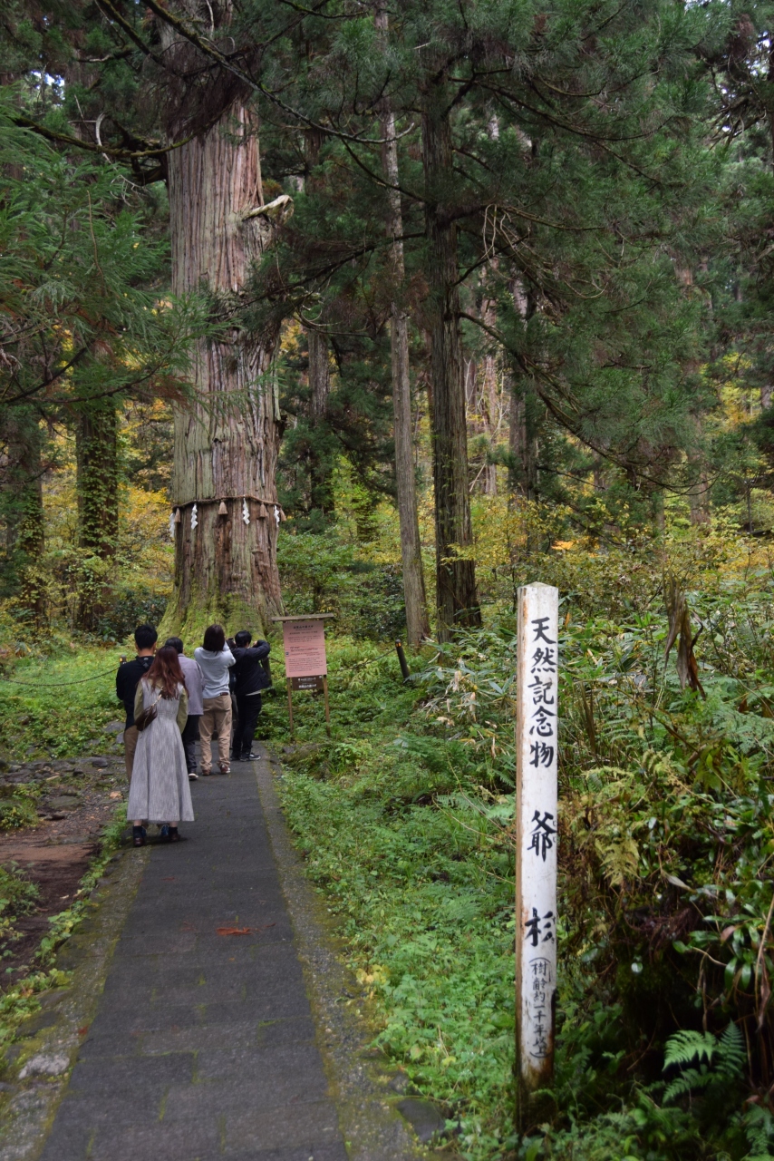 随身門から石段を下っていくと、羽黒山頂まで道の両側には国の特別天然記念物の杉並木が続くが、随身門から徒歩10分ぐらいの所に爺杉があった。説明の掲示板には「樹齢推定1000年以上・根回り10,5m・幹囲8,25m 羽黒山で最大最古の巨木。付近に婆スギがあったが明治35年(1902)の暴風に倒れる」と記載があった。