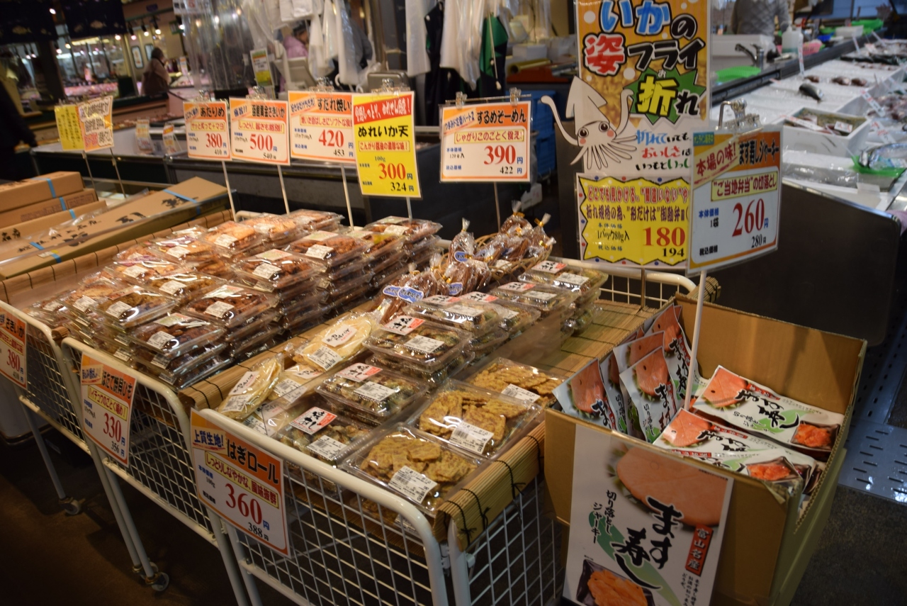 新潟循環バスに乗ると、最後の方に到着するピアBANDAIの中にある。巨大なディスカウントストアのような所を想像していたが平屋のフラットなつくりだった。他にあぶり焼きや食事所、オープンスペースがあった。魚棟は生モノが多く新鮮そうだったが旅行者のお土産には向かないので、乾物をゲットした。果物や地酒を扱う所もあり、そちらもいろいろ見てゲットした。