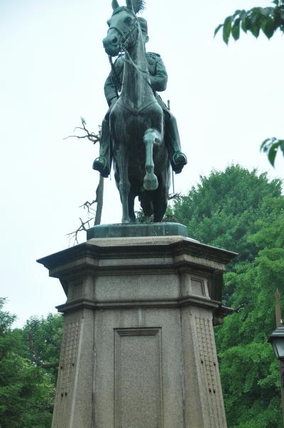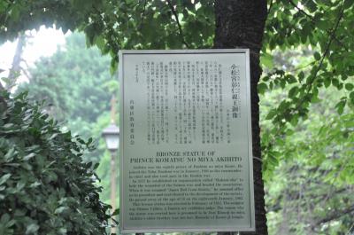 早朝の上野公園散策で、寛永寺根本中道を起点として、国際子ども図書館前、黒田記念館前を通って、不忍池方面に向かってしばらく歩いていると右側に銅像があり、小松宮彰仁親王像だった。お名前は存じ上げなかったが、戊辰戦争にも従軍した明治維新の功労者の一人ということだ。その後、日本赤十字社総裁として赤十字活動に貢献されたそうだ。訪問時、生憎の雨で傘を差していたので、写真は銅像の正面から1枚しか撮れなかった。天気の良い時に、堂々たる姿をじっくりと見てみたい。