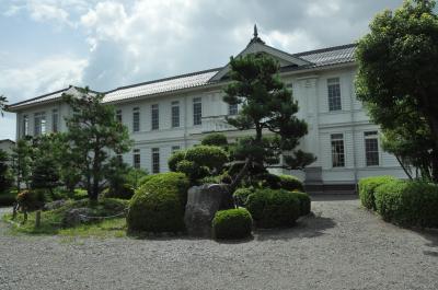 JR近江八幡駅前からバスに乗り小幡上筋で降りて、八幡堀に向かっている歩いている途中に白亜の立派な建築物があった。近寄ってみるとそれは近江八幡市立八幡小学校校舎であり、現役の公立小学校だったことに驚いた。縦長の窓が配された木造の洋風建築で、一見歴史的建造物のようにみえるが、外観はとても綺麗であまり古さを感じなかった。後で調べると、大正時代に田中松三郎氏の設計で建てられた校舎を最近オリジナルの意匠を残しながら改築したようだ。このような素晴らしい校舎の内部はどうなっているか見たかったが、もちろん無理。写真を撮って終了。