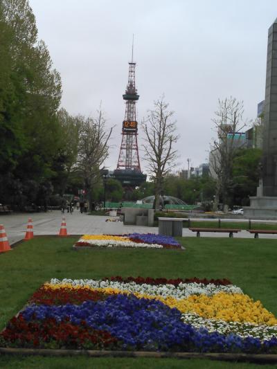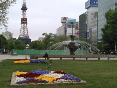 冬の札幌雪祭り直前に続いて、風薫る5月にテレビ塔を眺めた。今回は上に登らなかったが、テレビの天気予報などの画面でテレビ塔からの映像が時々流れているが、この季節は大通り公園の緑がずーっと東西に延びていて、遠近法的感覚で楽しめる。そして地上では、テレビ塔をバックにした大通公園の花壇の美しさが見事だった。今回驚いたのは、大通公園の各ブロックの花壇がテレビ塔から一直線に続いていることだった。花壇からテレビ塔に向かって写真を撮っている人がいたので、同じような位置に立ってみると、これまた遠近法的な眺望だった。噴水も周囲にマッチしており、気持ちも和んでくる。これからの季節、トウキビ(トウモロコシ)ワゴンも登場して、更ににぎわうだろう。