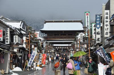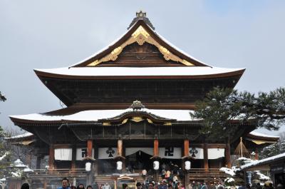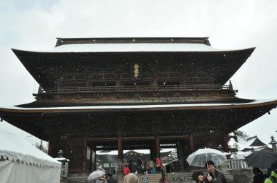 フルムーングリーンパス列島縦断旅行の2日目、朝、福島のホテルを出発して新幹線「つばさ」と「あさま」に乗り継いで長野駅に到着。善光寺までは結構距離があるようなので、時間があれば徒歩でもOKですが路線バスで行きました。結果は正解で、時間の節約ができました。でも天気はあいにくのみぞれ模様。「雪国から来て、雪景色か・・・」そのため、カメラは一眼レフを使うわけにはいかず、サブのコンパクトデジカメを使いました。参拝を終えて帰り道でようやく晴れてきて、参道を歩く道すがら少しワクワク気分になりました。長野駅へはやはりバスに乗り、「ワイドビューしなの」に乗って、車窓から信州のワイドな景色を見ながら松本に向かいました。