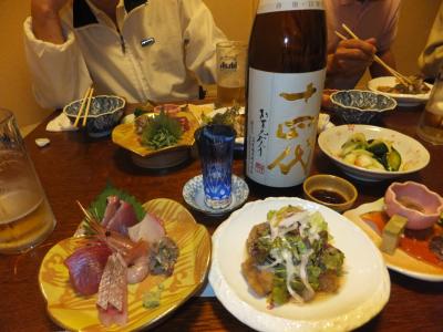 仕事仲間数名で山形に出張に行き、夕食会場を探していろいろ調べて選んだのが、「川なり」さん。仕事を終えて地図を頼りに探すと、住宅地のようなところに入り、本当にあるのか?と思ったらありました。時善意電話して「どんなお酒がおいしいですか?」と聞いたら、「十四代とかありますよ」とのこと。初めて聞く名前でしたが「では、それをお願いします」と伝えました。ビールで乾杯した後、出てきたのが「十四代」、さっそく呑んでみるとビックリです。「こんなにフルーティでおいしいお酒があるのか?」と思うほど美味でした。一升瓶の少しあいた状態で出てきましたが、店の方に「今日はこれ、預けます」と言って頂いたので、もちろんみんなで飲み干しました。とても気に入ったので、翌日にお土産屋さんで探したところ「十四代は、特定の居酒屋さんとかでなければ置いていない」とのことでした。全く入手できず、幻の銘酒との一期一会でした。