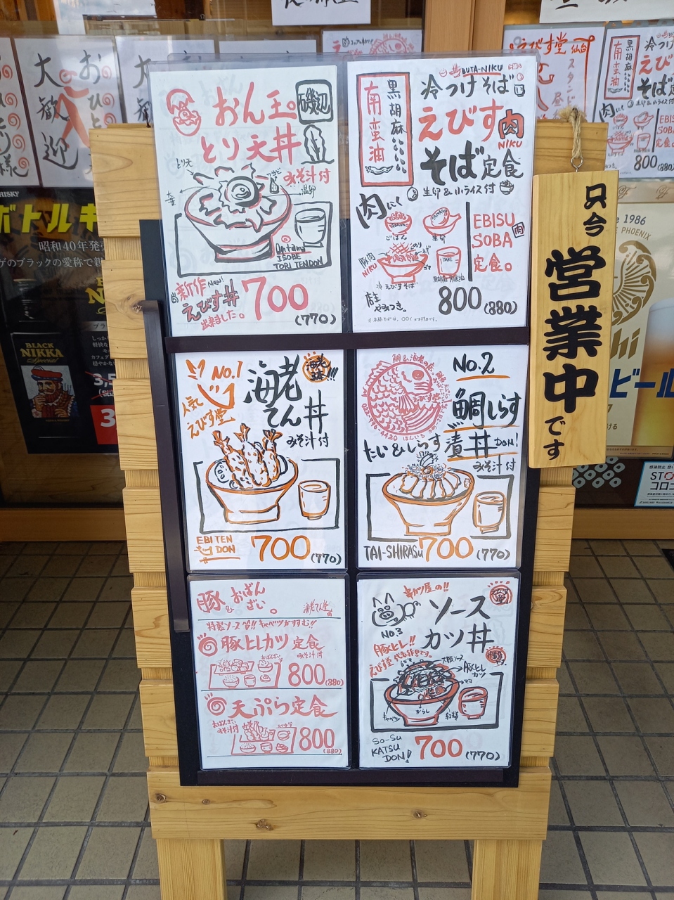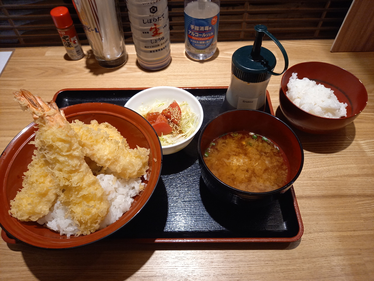 定禅寺通の東端にあります。店内はカウンター6席、テーブル24席位です。今回はお店の一番人気の海老天丼700円(税抜)をいただきました。エビが3本とちょっとした野菜四種類乗ってました。そしてご飯大盛り無料でした。最初に頼まなかったのに後から追加でご飯持ってきてくれました。天婦羅には目立った味が付いていませんので、タレは自分でかける感じです。タレは万人受けする美味しいタレでした。