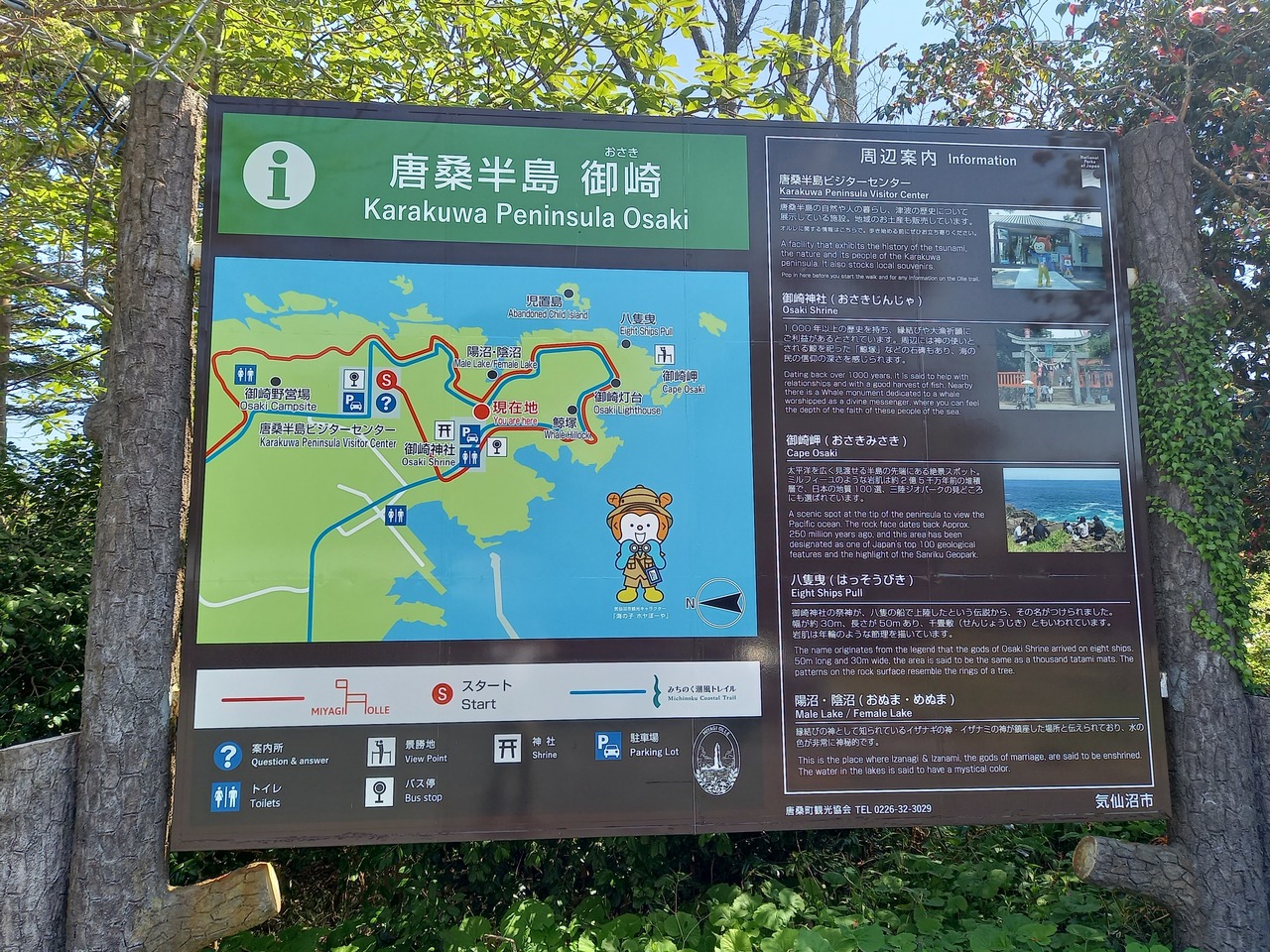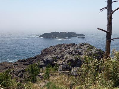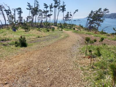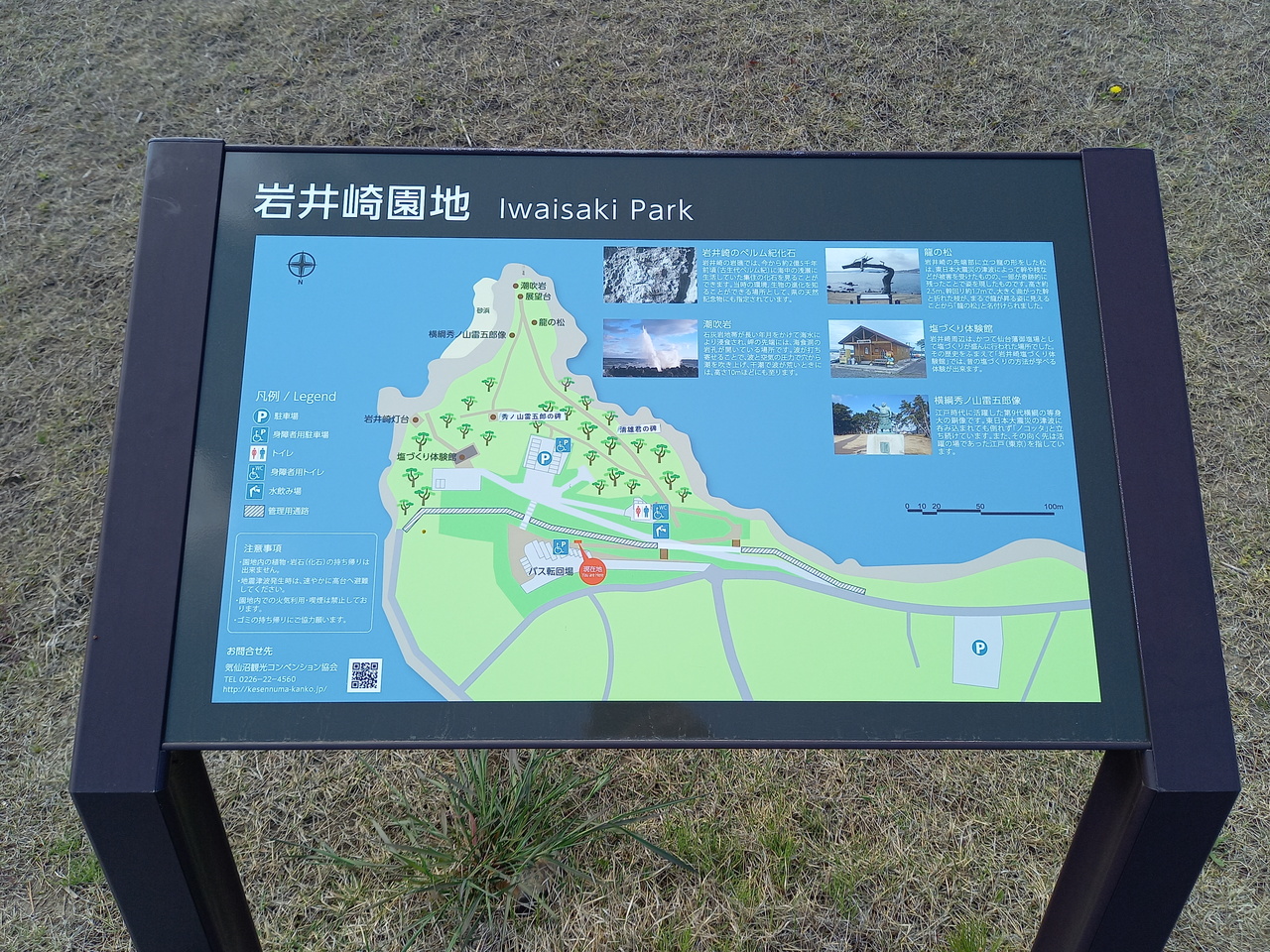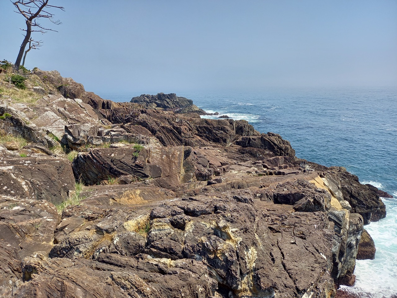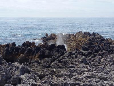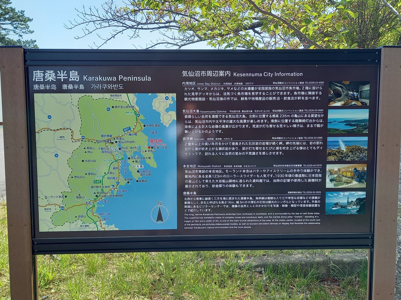 唐桑半島の太平洋側、中ごろにあり、波で浸食された大理石の奇岩が連続している景勝地です。それぞれの場所はちょっと離れています。どちらにも駐車場が整備されています。名前の由来は、浜から沖合を見たとき、大きな釜の中でお湯が煮えたぎっているように見え、沖にある岩が蓋のようにも見えることから「巨釜」、この辺ではアワビ等の貝類を採って繁昌したことから、「繁昌」がなまり「半造」と言われています。中でも、巨釜側にある大理石の石柱「折石」は代表する1つで、明治の三陸大津波の際、先端部分が2メートルほど折れたことから折石と名付けられたそうです。半造側は、津波の影響か、松が枯れていて別世界の様です。遊歩道にはウッドチップが敷かれていて歩きやすい。