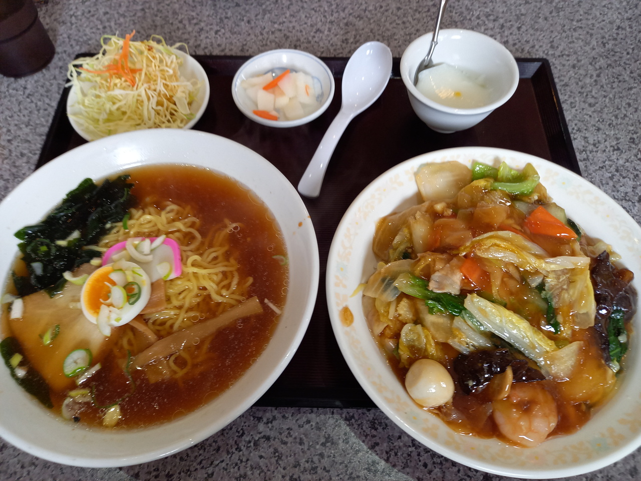 サービスセット料理はらーめん1人前とご飯もの1人前のセットで、満腹