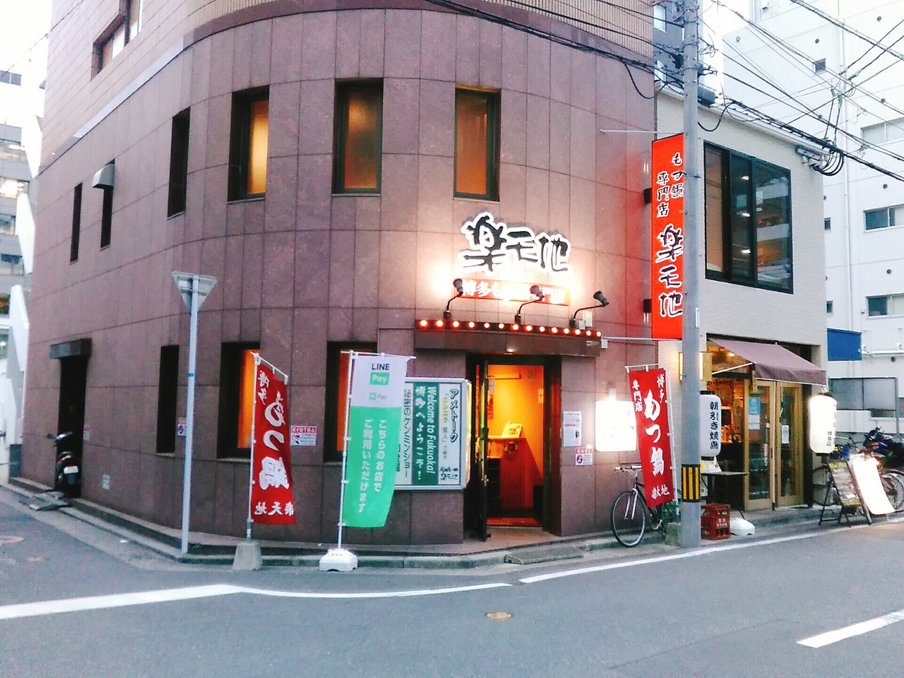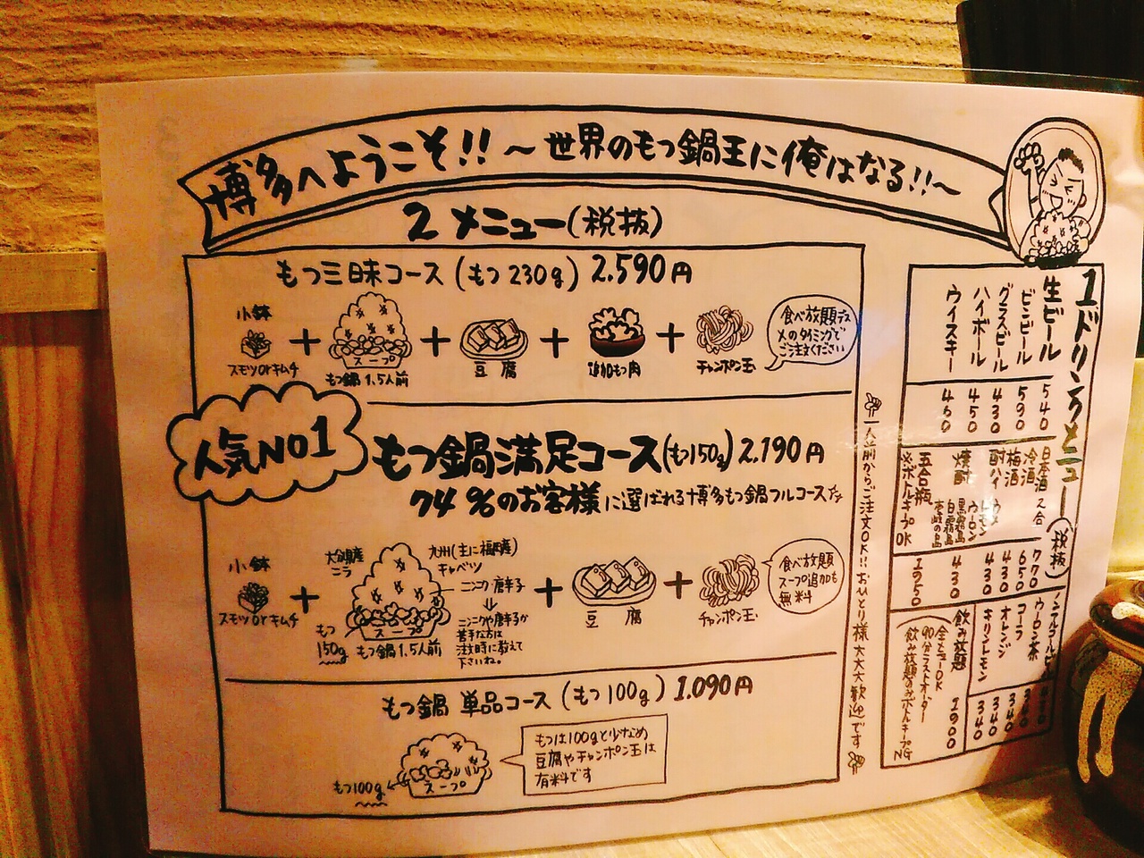 大きい通りからちょっと入った所にあります。隣はホテルアクティブ博多です。建物4階全てがお店です。110人以上は入ると思います。今回は単品コース1080円をお願いしました。モツ鍋だけでお腹いっぱい食べるなら、人気No.1の満足コース2190円をお奨めします。モツは柔らかく醤油味が美味しかったです。 でも、単品は盛りが寂しかったので、たまらず、チャンポン麺260円を頼んでしまいました。麺はもちもちで美味しかったです。