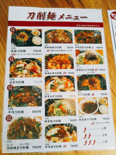 長町インターに向かう道路沿いにあります。車線は反対側です。中華料理のお店で、刀削麺が売りです。店内は広く、楽に60人は入ると思います。ランチメニューが豊富です。刀削麺は13種類もあります。メニューの番号見ると175番迄ありました。今回は、辛し味噌刀削麺780円をいただきました。麺は噛む感じで、喉ごしは期待出来ません。具と一緒に食べると食べやすく美味しかったです。