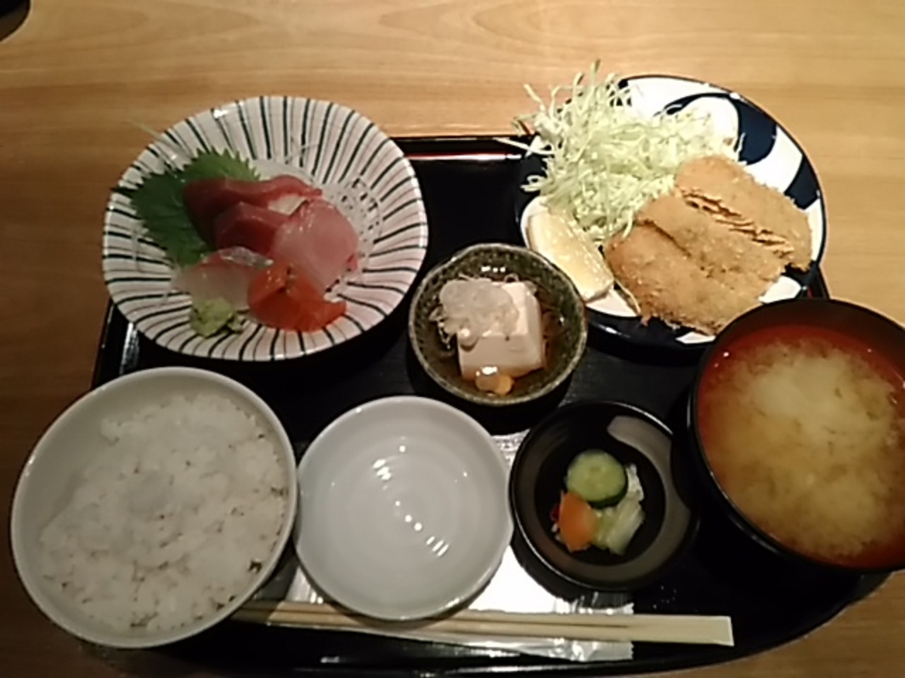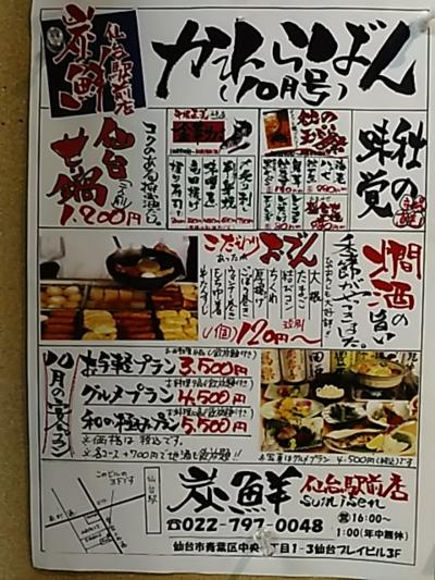 定禅寺通り沿いのビル4階にあります。金沢おでんや加賀野菜等、石川県の郷土料理が味わえるお店です。お昼過ぎに行ったら満席で女子率が高く、店員さんと気軽に話しているので、常連が多いようです。ランチはかき揚げ御膳925円(税抜)が人気のようです。今回は、サービス御膳800円(税抜)にしました。お任せ刺盛りと鮭のフライの定食です。鮭のフライは、油っこくなく食べやすかったです。作りおきではないので、揚げたて、盛りたてがいただけますが、時間がかかります。