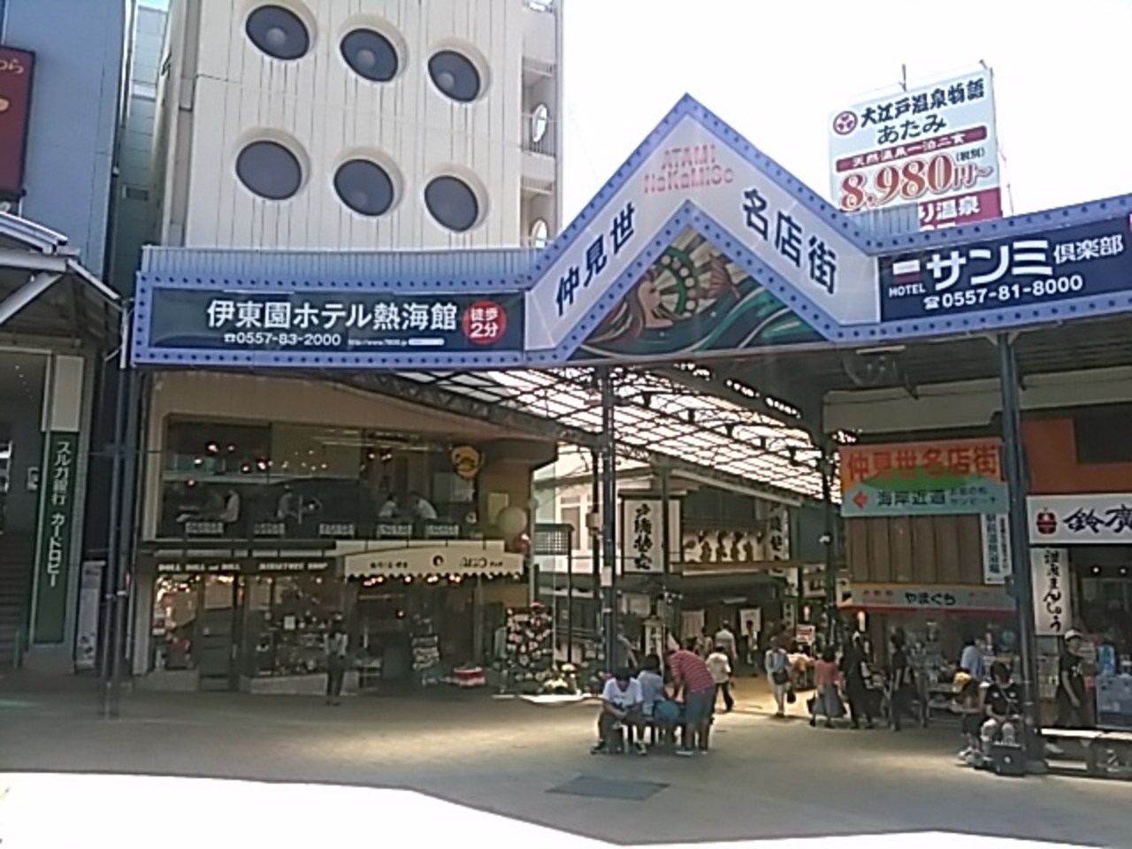 熱海駅前にあります。改札を出て右手に進むと、一本目は平和通商店街ですが、二本目のアーケード街が仲見世通り商店街です。トンガッタ看板が目印です。全長120メートル位で坂道になっています。平和通商店街同様、干物や海産物のお店が多いです。駅から近いので、ちょっとした時間でも行けるのが良いです。