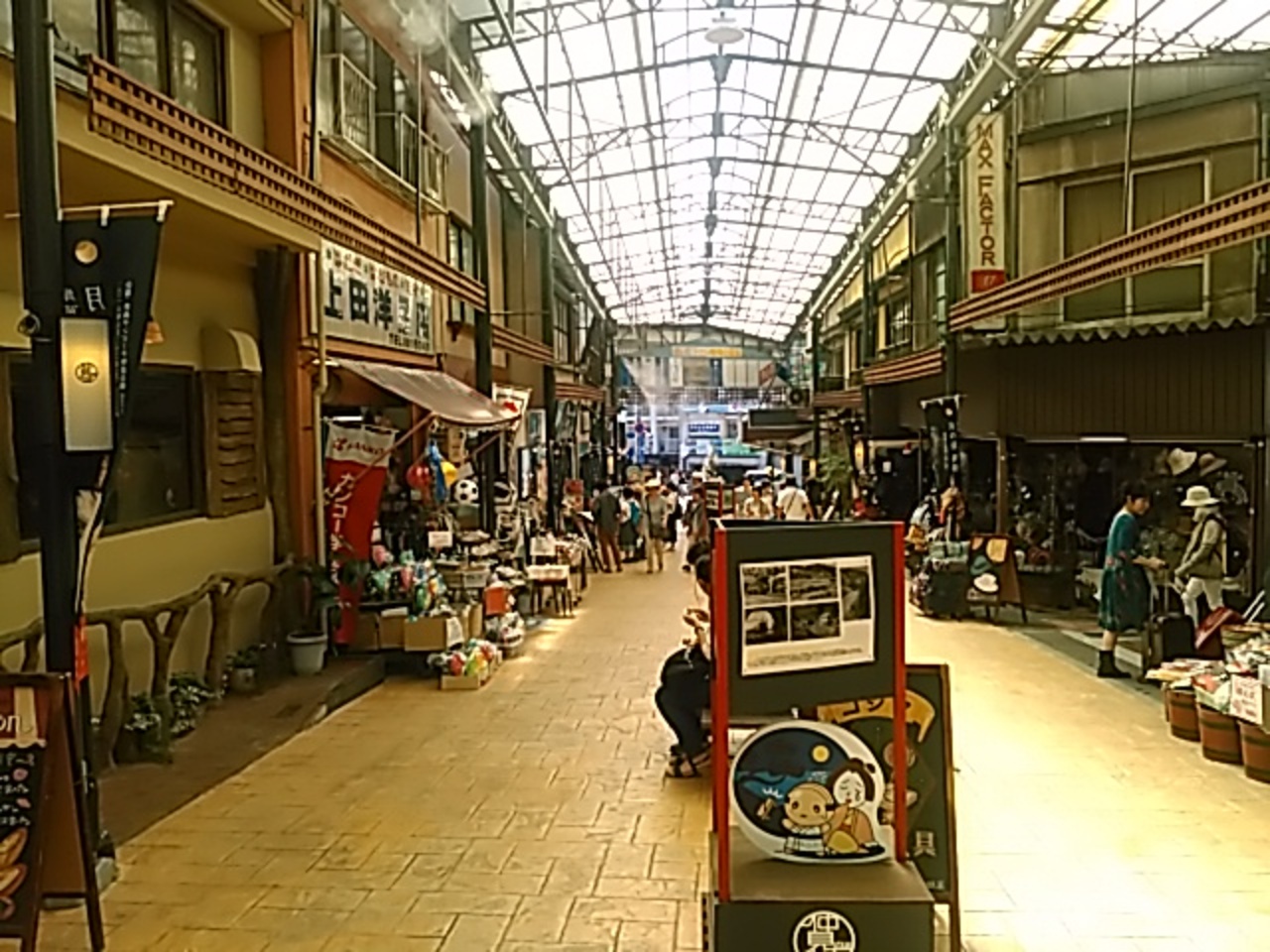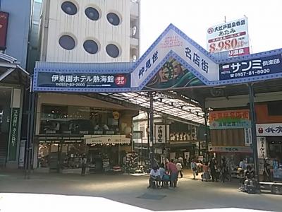 熱海駅前、右手、一番手前のアーケード街で非常に駅に近いです。全長200メートル弱に45軒がひしめいていて、ちょっとした時間でも見ることができます。干物や海産物のお店が多く、試食が充実している店もあり、味を確認してから買い物することができます。
