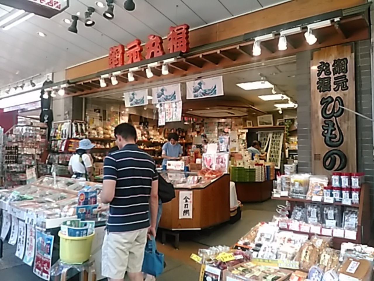 熱海駅前、改札を出て右手、一番手前の熱海駅前平和通商店街にあります。ご飯に乗っけるまたは酒のつまみに最適な珍味が豊富です。試食が充実しているので、味を確認してから買い物することができます。WAONも使えたので買い物が便利でした。