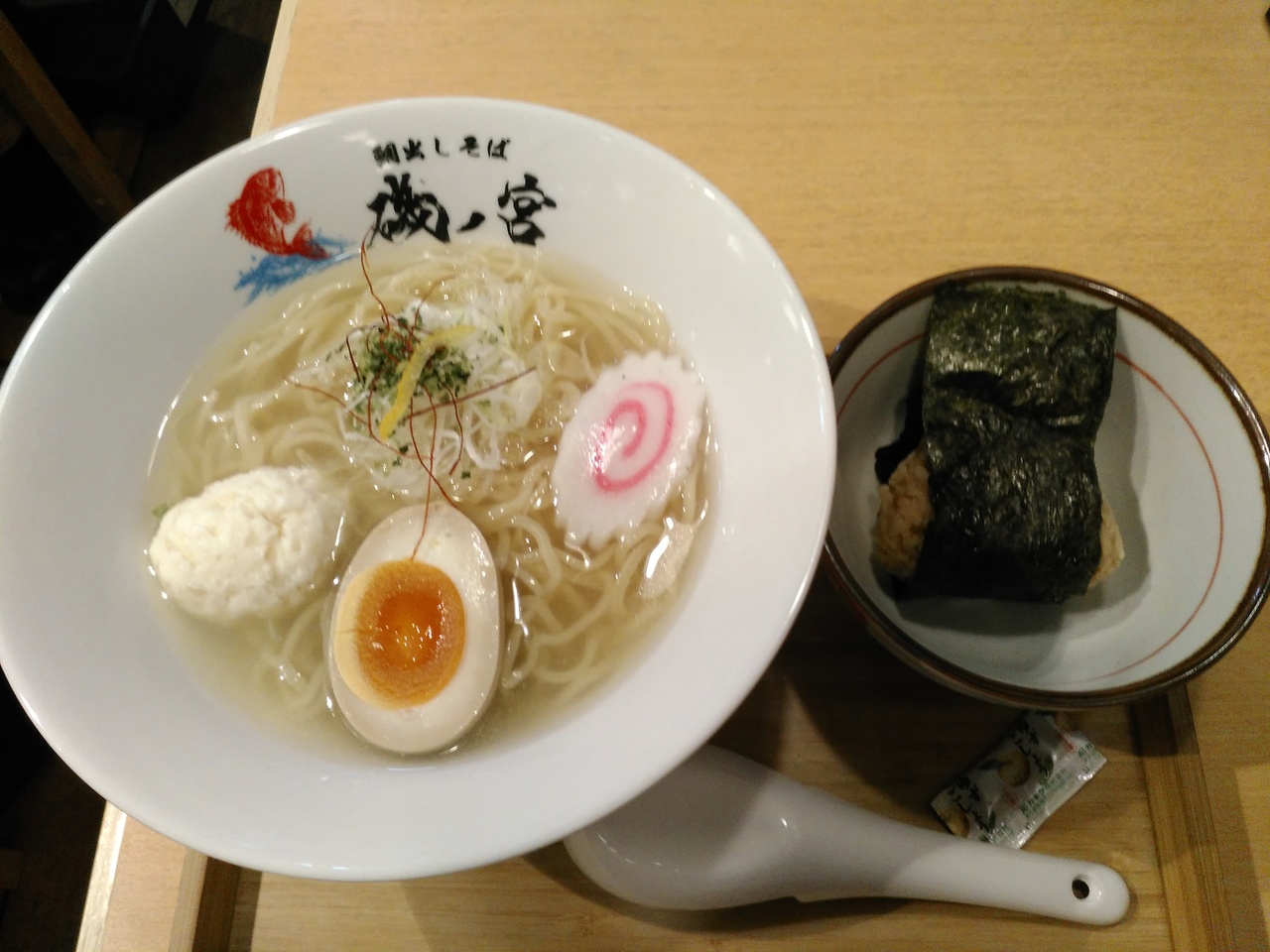 (磯ノ宮)鯛の出汁が効いています。麺はつるつるでした。おにぎりはお茶漬けにしてもで良かったです。