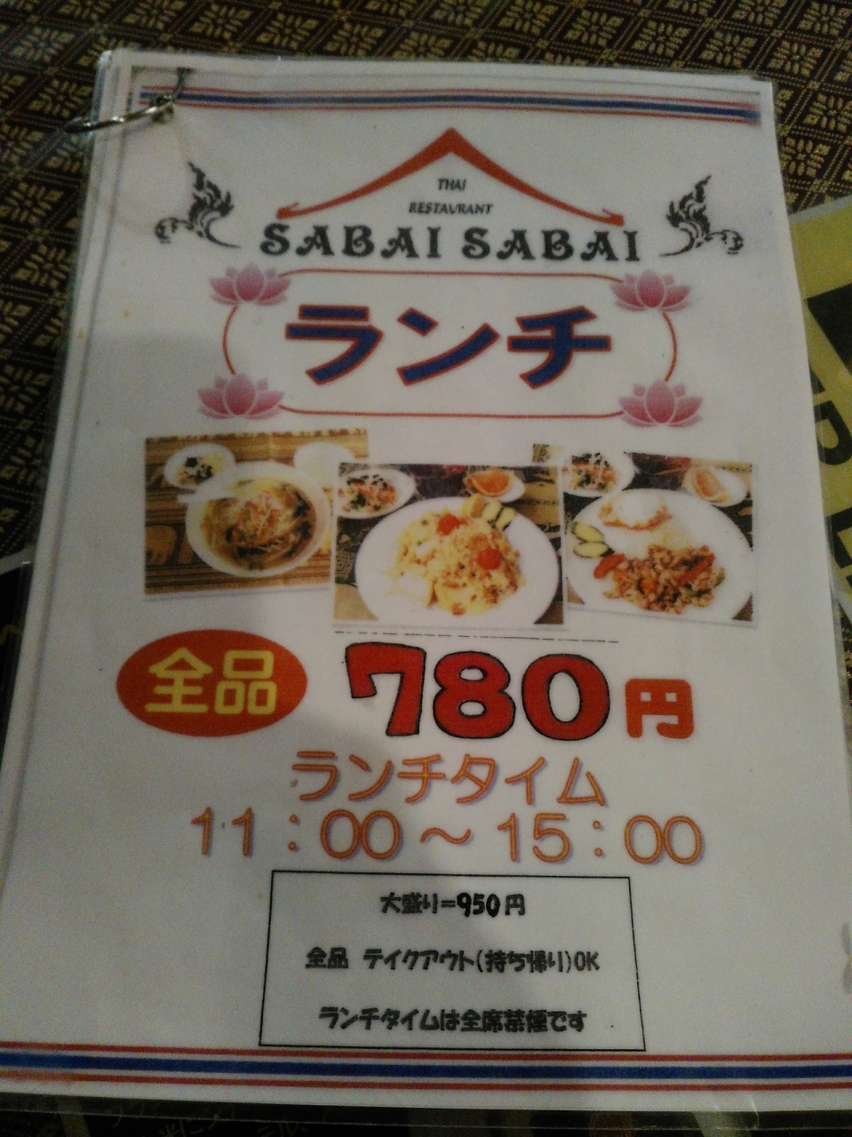仙台の繁華街、国分町通りを北に進んだ二日町にあります。タイ料理の店で、カレーや炒飯等、ランチは9種類以上から選べ、全部780円(税込)です。スープにサラダ、ミカン等のデザートも着きます。大盛りは950円(税込)とちょっと急に高くなりますが、食べ答えはあります。メニューは初めての人にも選び易いようにフローチャートになっています。