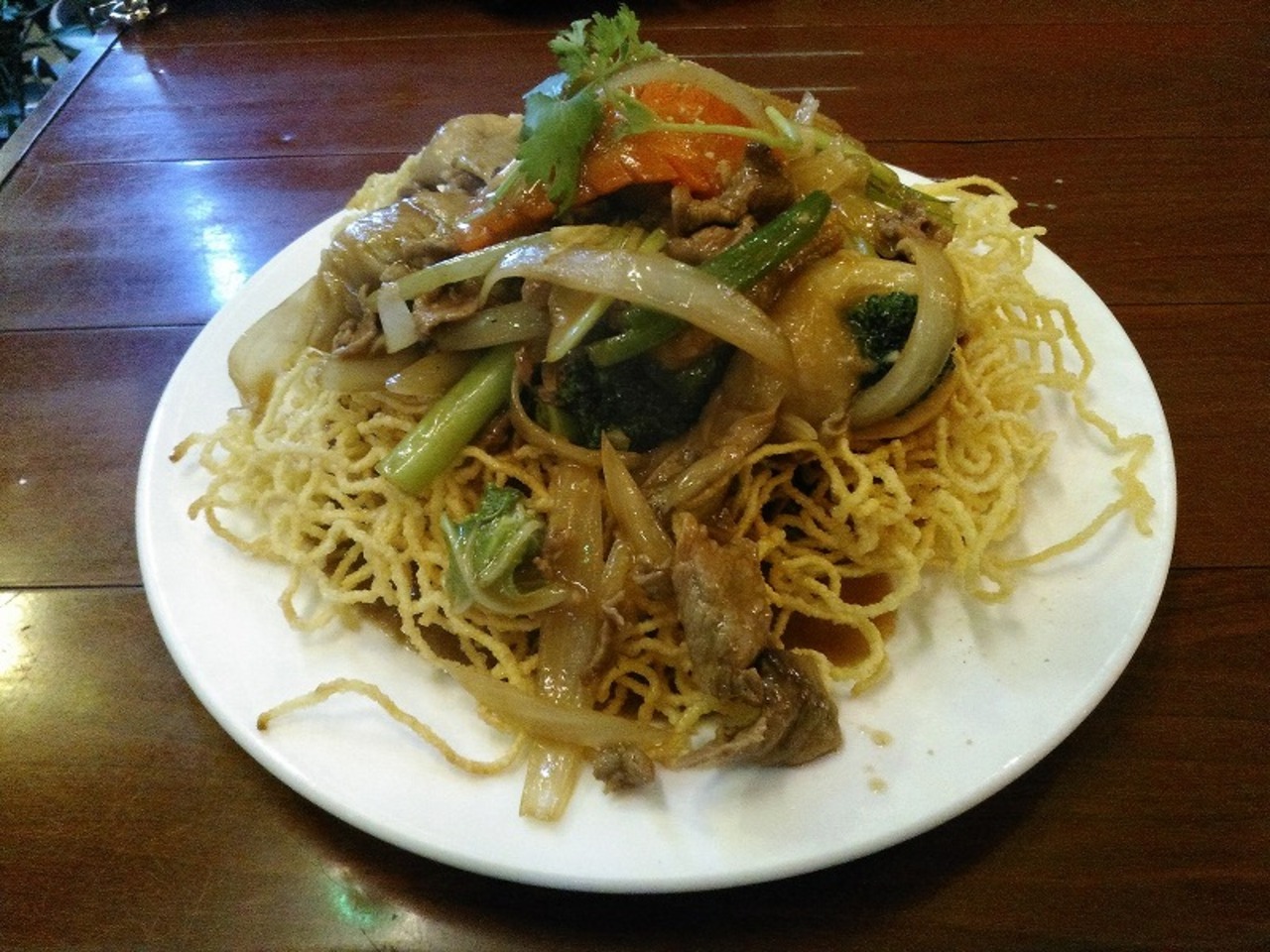 デタム通りの宿泊先ホテルの管理人さん教えてもらいました。タウン誌に載っていた焼きそばの美味しい店の場所を聞いたら、バイクに乗せて連れてってくれました。デタム通りの2本東側の露地にあります。ホテルの入り口がレストランとなっていました。焼きそばはシーフード味で、麺の焼き方はクリスピーかソフトを選べます。実を言うとタウン誌の店とは違う店でしたが、クリスピーは本当にカリカリでおいしかったです。これも旅の醍醐味ですね