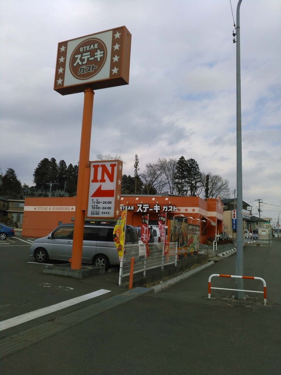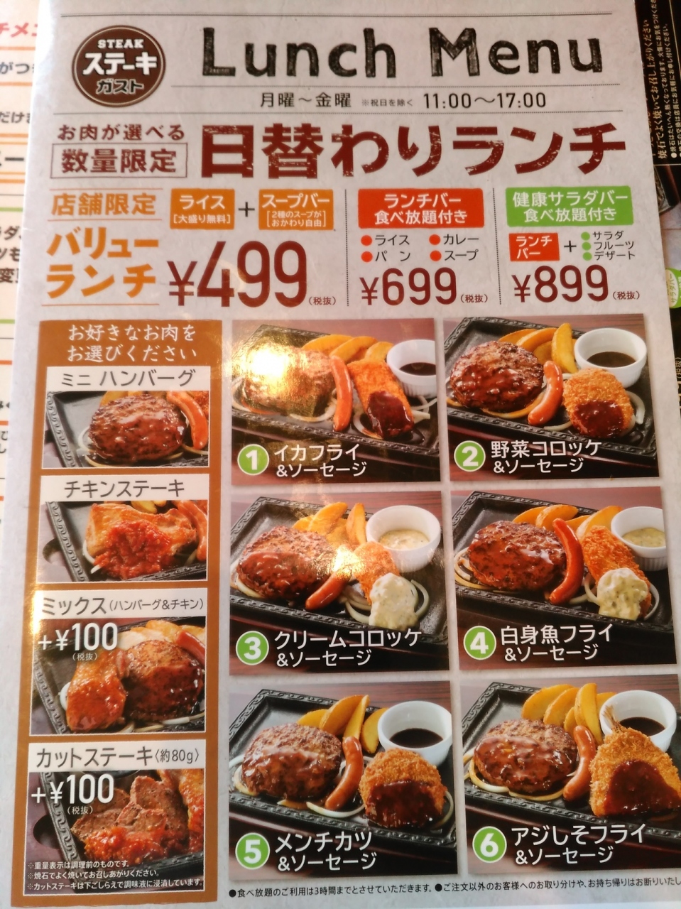 利府街道、仙台市営バスの仙台東営業所の近くです。カフェガストは行ったことありましたが、ステーキガストは初めてです。平日だと499円(税別)から日替わりランチあります。ライス大盛り無料で2種類のスープバーが付きます。これだけでも、結構いっぱいですが、+200円でご飯・パン・カレー食べ放題、+400円で更にサラダバーも食べ放題になります。サラダバーにはかき氷もあるので、楽しめますよ。