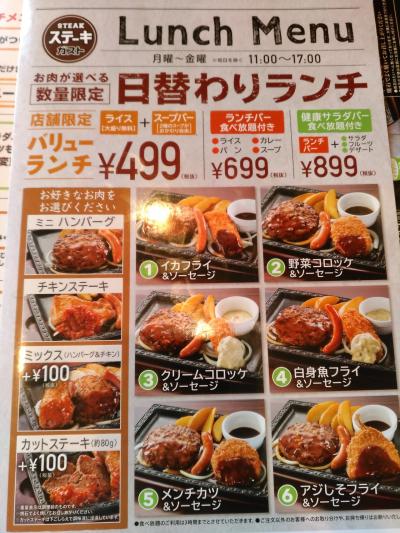 平日だと499円(税別)から日替わりランチあります。ライス大盛り無料で2種類のスープバーが付きます。