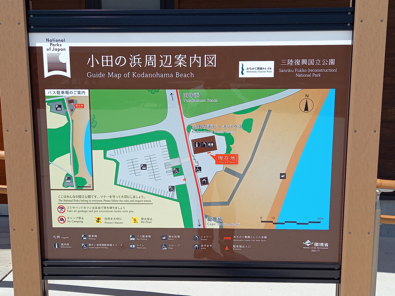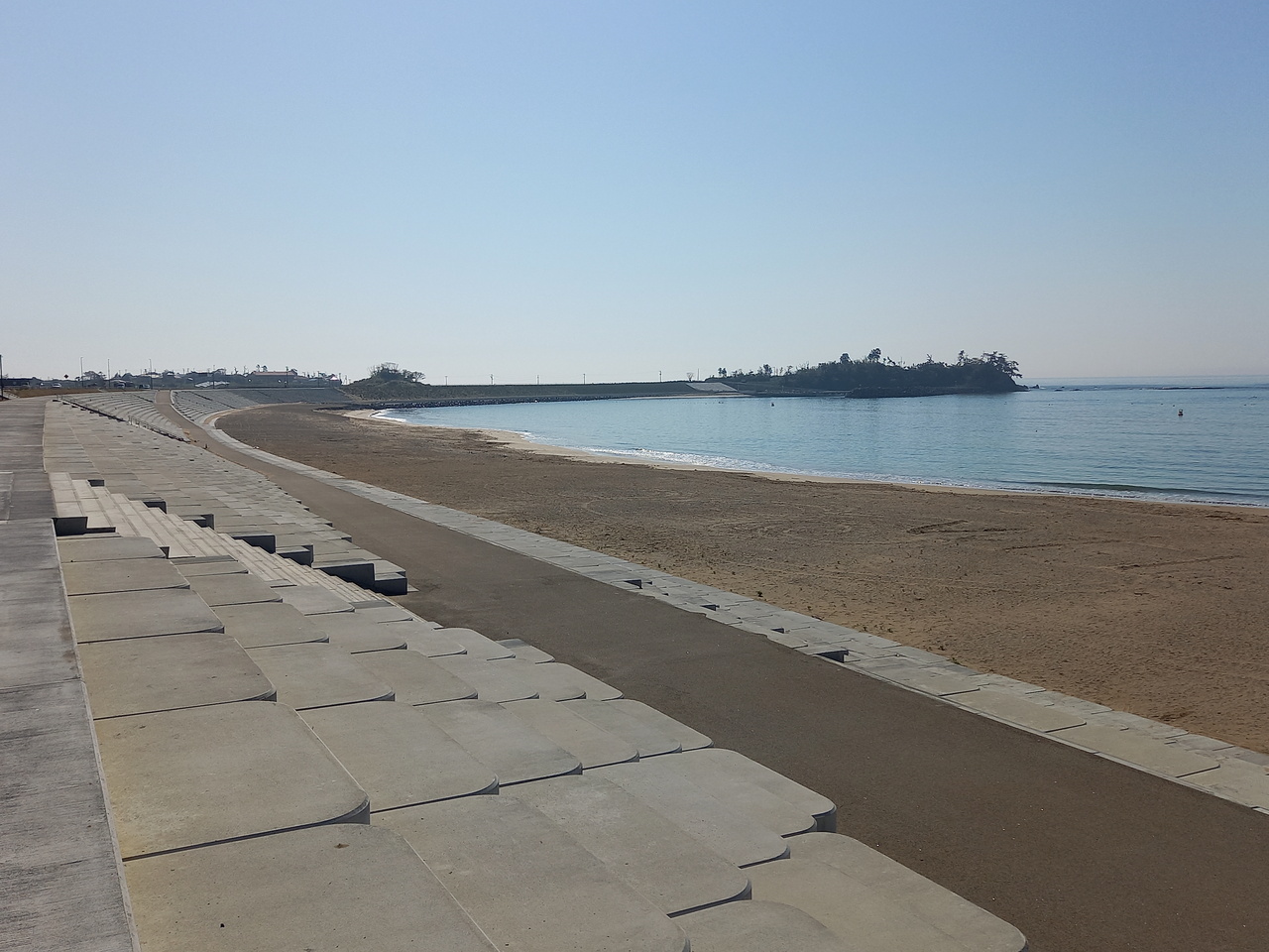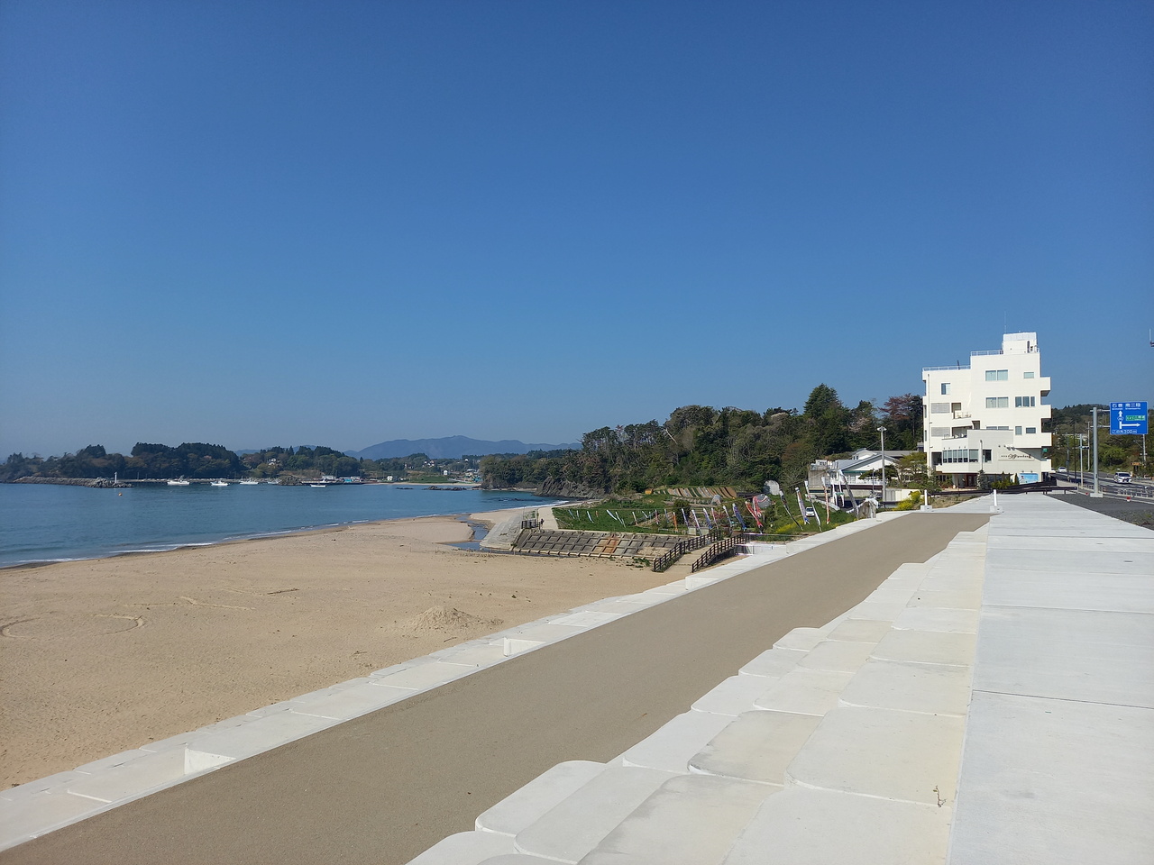 大谷海岸は遠浅の海岸線と砂浜が広がる約2kmの海岸でしたが、東日本大震災の津波では砂浜の多くが失われています。復旧はかさ上げした国道が防潮堤を兼ねる形でなされ、震災以前とほぼ同じ広さの砂浜を確保し、令和3年に海水浴場として復活しました。すぐ近くには道の駅「大谷海岸」(BRT駅兼ねる)があり、三陸道やJR気仙沼線からもアクセス良好です。