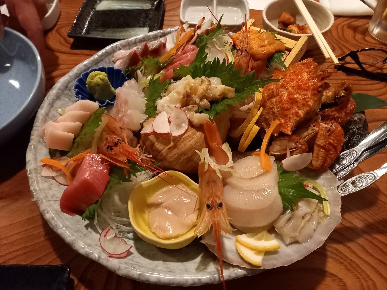 1階はカウンター4,5席,テーブルが12席位です。2階にも座敷ある様なので宴会にも利用可能です。今回は刺身の盛り合わせをメインにいただきました。刺身の種類が凄いです。メカジキ、マグロ、カンパチ、タコ、ツブ、ホタテ、ウニ、カニ、マダイ、エビ等など。店員さんも改めて確認しないと分からない位盛ってました。お勧めです