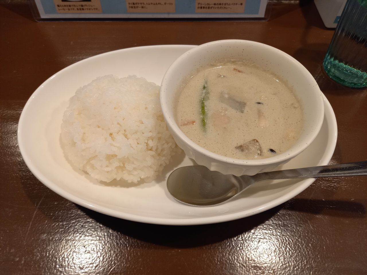 東北電力本社の近くで、国道45号線の北側、路地を入ったところにあります。店内はカウンターのみ5,6席です。ランチはカレーが8種類とガパオライスです。値段は500円から800円です。今回はグリーンカレー750円をいただきました。辛くなくさらっといける感じでした。後で気付きましたが、大盛り無料でした。