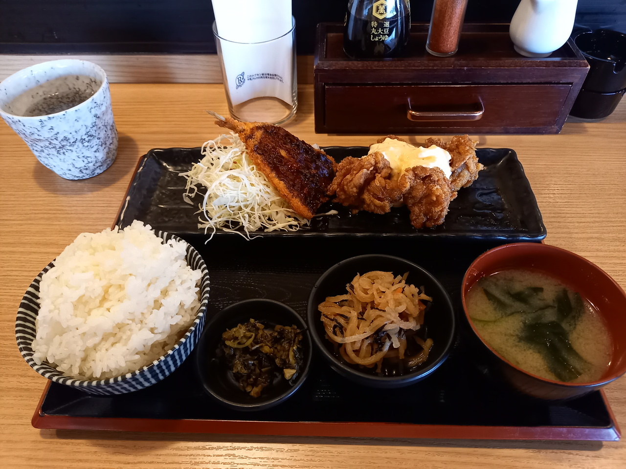 定禅寺通と仙台駅前の通りとの交差点にあります。店内はカウンター6席、テーブル28席位です。ランチは五種類で800円前後です。ご飯の大盛りは無料です。今回はチキン南蛮とアジフライ定食830円(ご飯大盛り)をいただきました。アジフライは薄めですが、カリカリでした。最初からソースがたっぷり掛かってきます。チキン南蛮は唐揚げに酸味の効いたタルタルです。お店は落ち着いた感じですが、片付けの音がうるさくて気になりました。