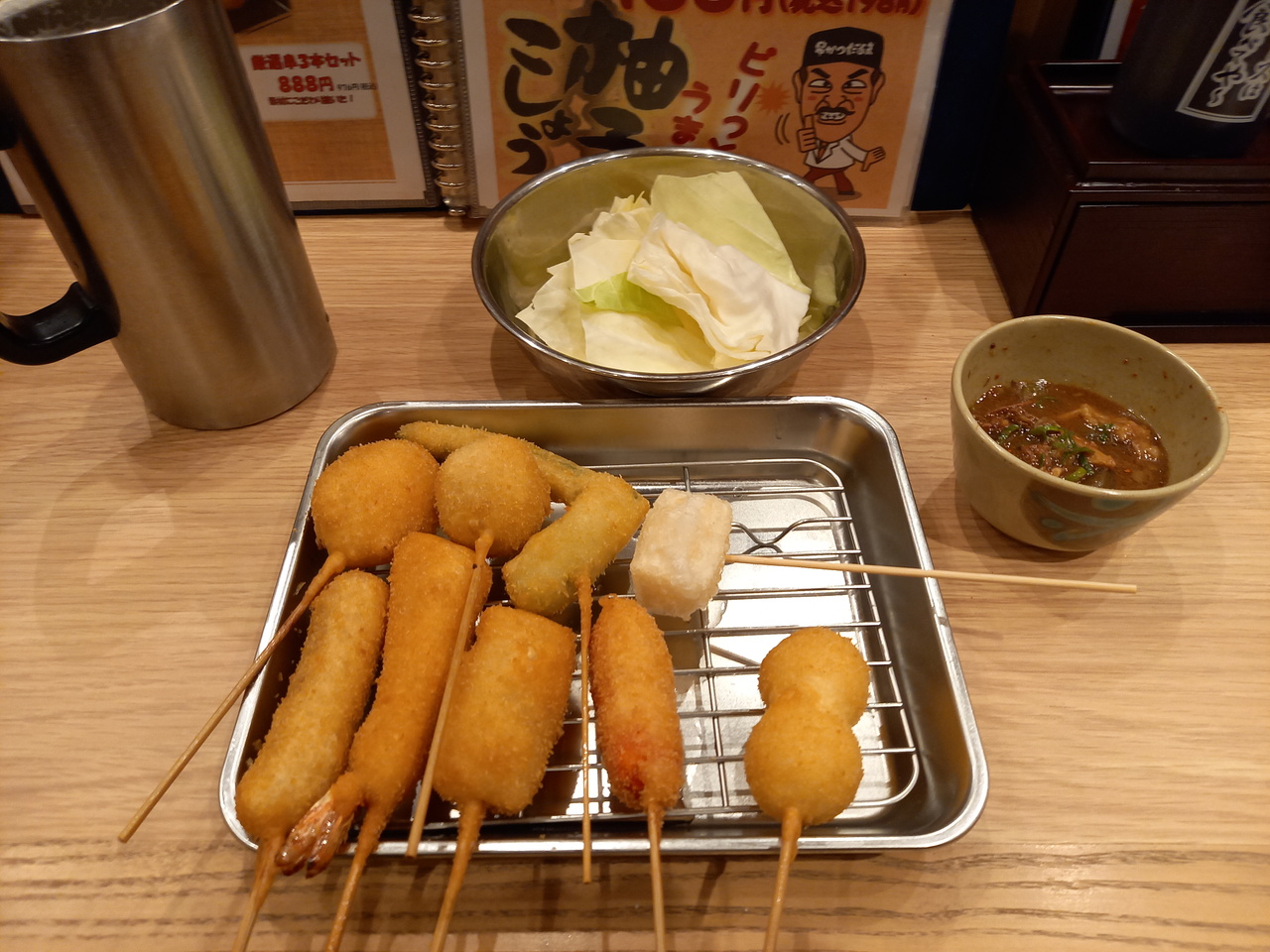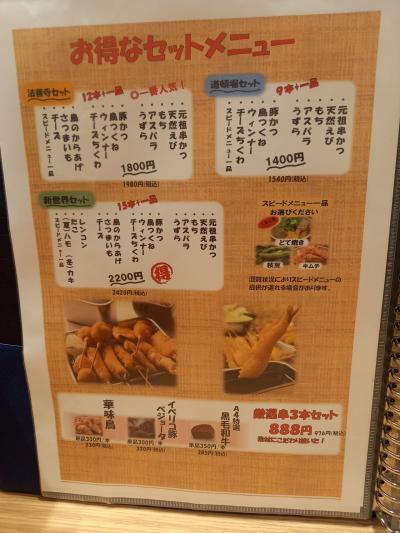 道頓堀のちょっと入った所にあります。11時の開店でしたが30分前には6人、開店時には30人以上が並んでいました。大阪の串かつで間違いないところです。今回は、セットメニューの道頓堀セット1400円をいただきました。串かつ9品とどて焼きなどがいただけます。どて焼きは味が染み込んで美味しかったです。新型コロナの影響で二度付けは出来ないようになっていました。セットはお得でした。