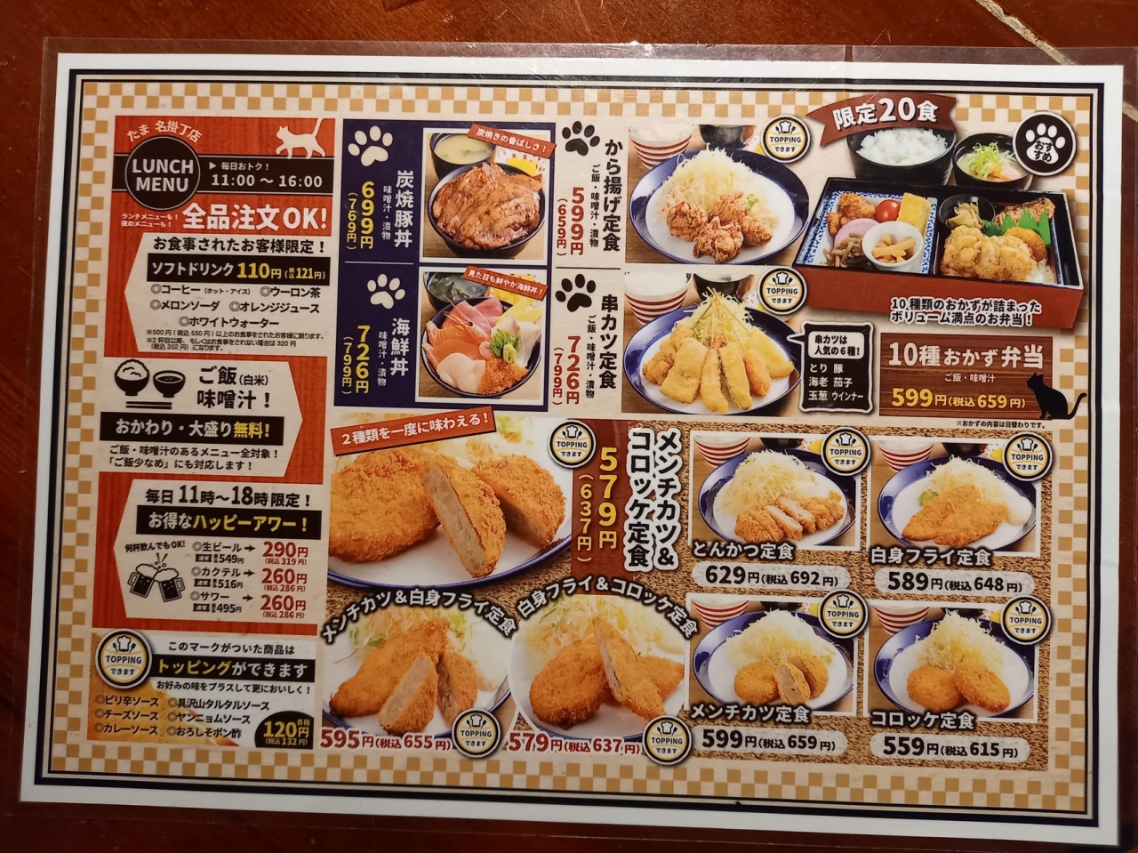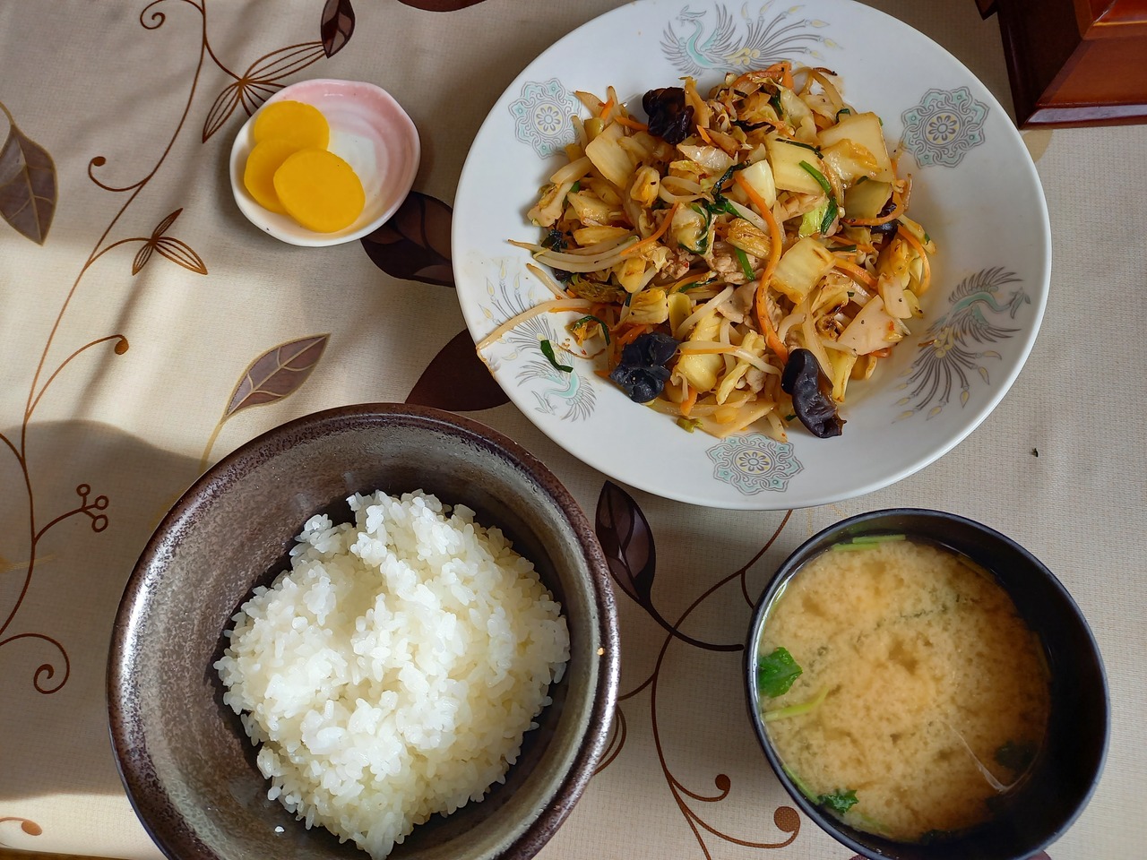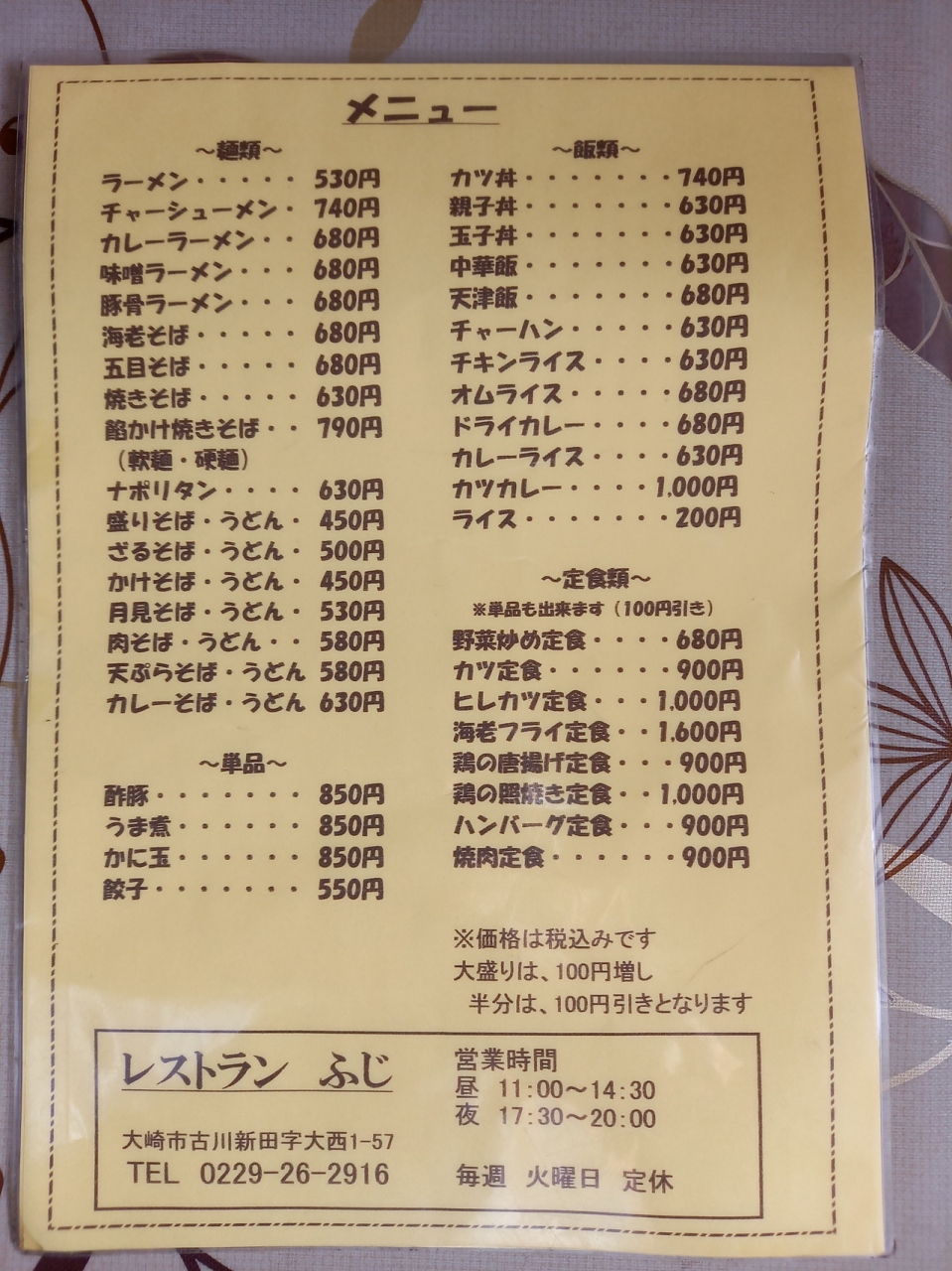 国道108号線沿いにあります。古川インターチェンジから1キロほど西側です。1階は8席位ですが、2階もあります。メニューはラーメンが530円から、丼は親子丼が630円からです。今回は野菜炒め定食680円をいただきました。色目は悪いですが、具は白菜、モヤシ、ニラ、人参、イカ、肉、筍と結構入っています。味はちょい辛で、塩っ気が強かったです。店のメニューで面白いのは、オムライスに福神漬けが添えられていました。