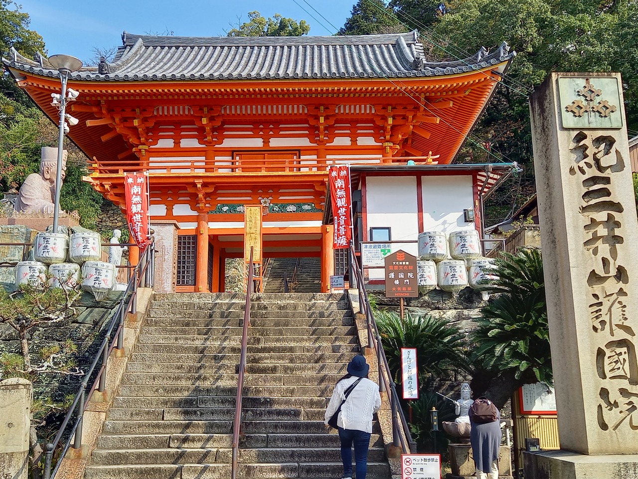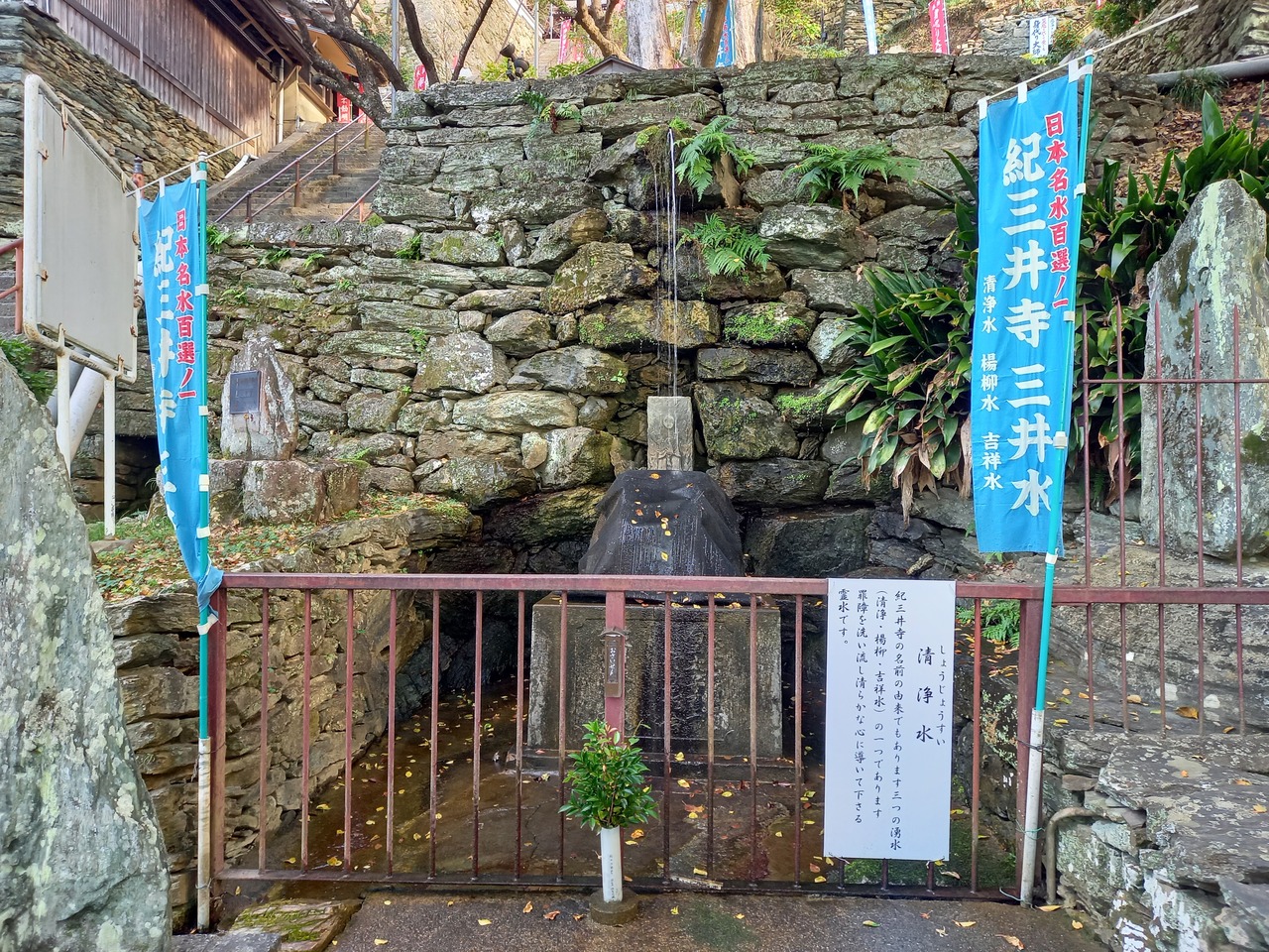 「きみいでら」と読みます。紀三井寺は、今からおよそ1250年前の奈良時代に開かれたお寺です。紀三井寺とは、紀州にある三つの井戸があるお寺ということで名付けられた様です。今も境内の井戸から水が湧き出していて、参道からは井戸の一つ清浄水(しょうじょうすい)を見ることが出来ます。境内からは、和歌の浦が箱庭のように見え、眺めが素晴らしいです。