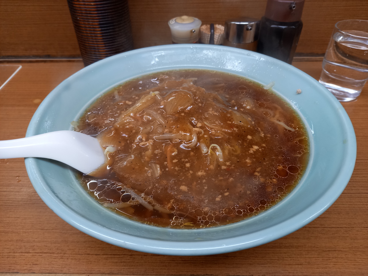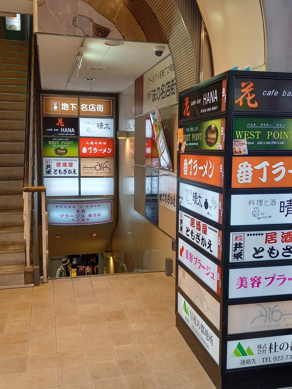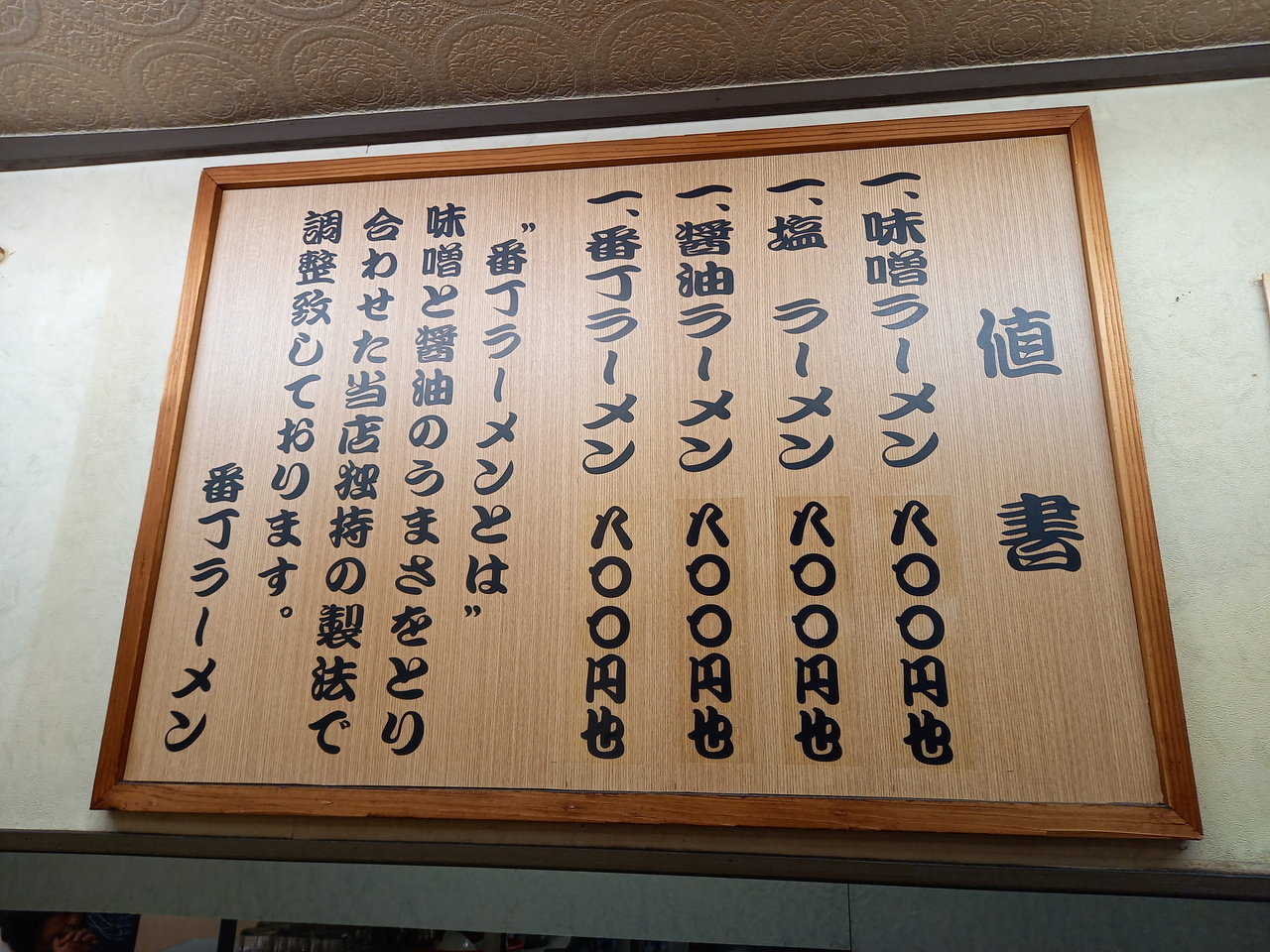 仙台駅前アーケード街のビルの地下一階にあります。カウンターのみ10席位です。メニューは味噌、塩、醤油の他に番丁ラーメンがあります。番丁ラーメンは、醤油と味噌のハイブリットです。値段は全て800円です。今回は番丁ラーメン800円をいただきました。いただいてみると、番丁ラーメンは、醤油ベースのスープに、ちょい辛味の味噌味のあんかけが載っていました。でした。 餡の野菜はモヤシどっさりでした。