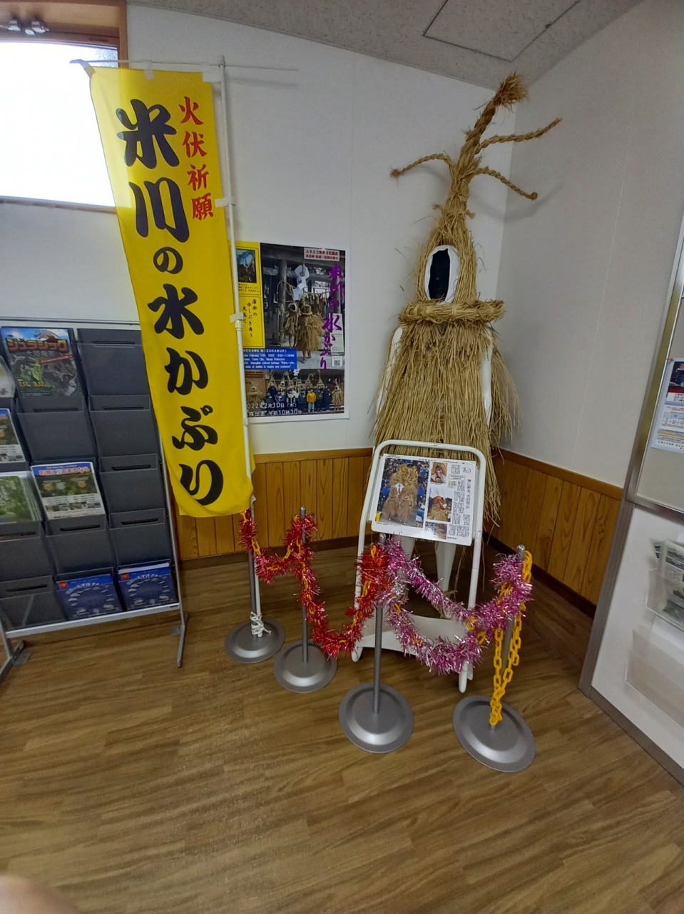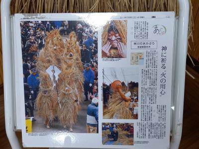 米川の水かぶりは東和町の北東にある米川地区で行われる行事です。この行事は毎年2月の初午の日に行われ、裸に藁で作った水かぶり装束を身に着け、顔にすみをぬった男たちがバケツの水を家々に掛けながら、火伏せを祈願して歩くものです。沿道の人達は藁を抜き、自分の家の屋根に上げて火伏せを祈願します。米川に行った時が7月だったので2月に来るときは、水がかかってもいい格好で行きたいと思います。
