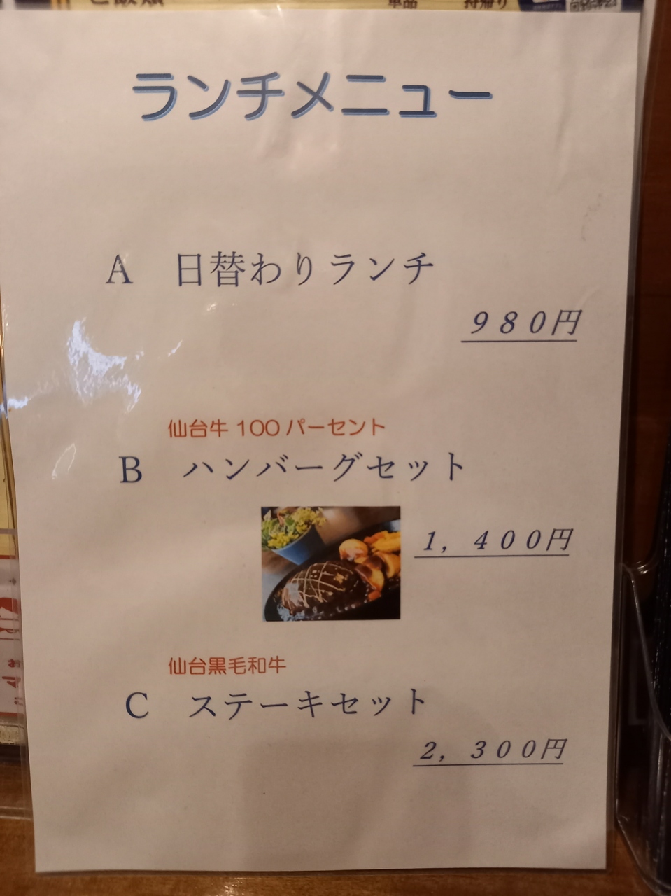 佐沼警察署前の通りの一本東側の通りを入った所にあります。ランチメニューは、三種類で980円から2300円です。今回は日替わりランチ980円をいただきました。行った日の日替わりは、ナポリタンに小さいハンバーグが乗ったランチでした。メインの他にサラダとスープ、ドリンクが付きます。ナポリタンは鉄板で出されるので最後迄熱々でした。