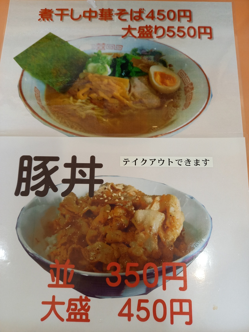 イオン佐沼店の近くにあります。店内はカウンター10席位、テーブル20席位です。メニューは、ネギラーメンが350円からあります。ラーメン(煮干し中華)450円よりも安いです。今回は、ネギラーメンと豚丼並み350円をいただきました。卓上には豆板醤とニンニクの大きいボトルがあります。スープは、塩気が強い。豚丼の肉は硬い。麺は中太で、カップ麺かと言うくらい短麺です。