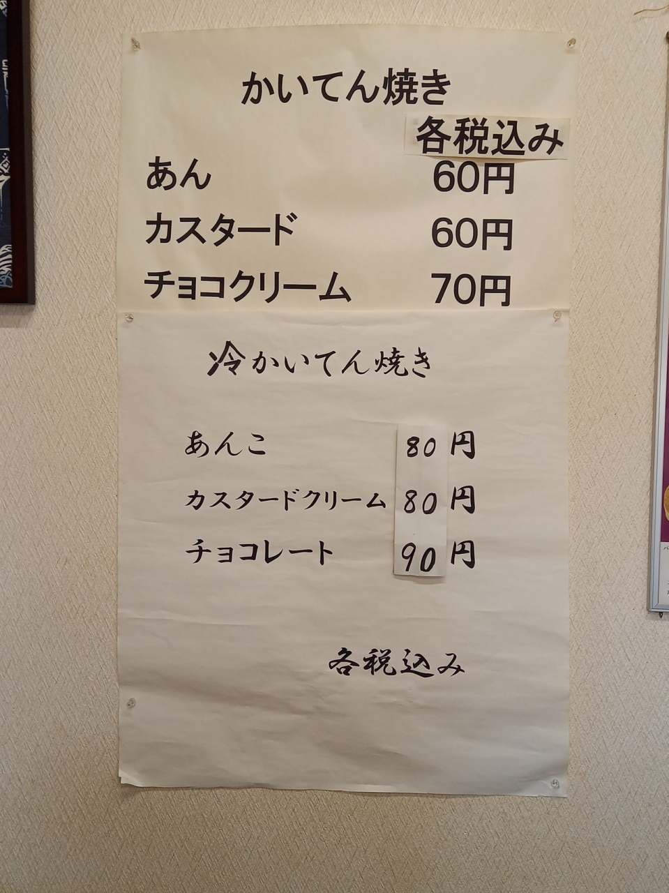 登米市豊里町内に二店舗あり、薬王堂の近くの店が回転焼き専門の様な感じです。回転焼きの味は、あん、カスタード、チョコの三種類で大判焼きの様な普通のもの(60円から70円)と夏場にピッタリな冷し(80円から90円)があります。今回は、冷やしを三種類いただきました。どれも美味しいのですが、お気に入りはカスタードでした。